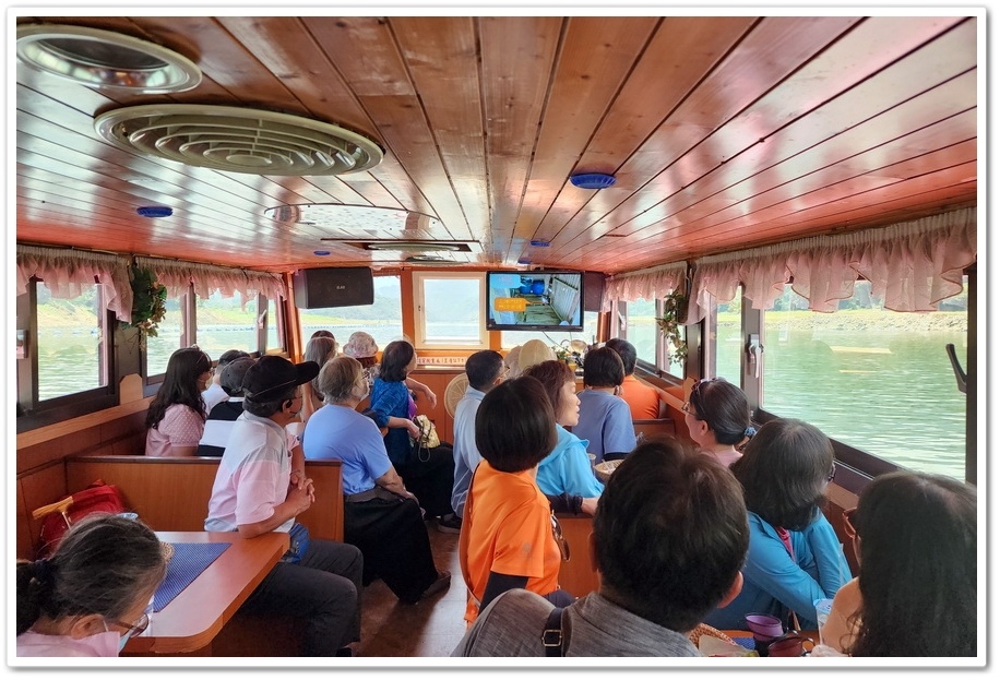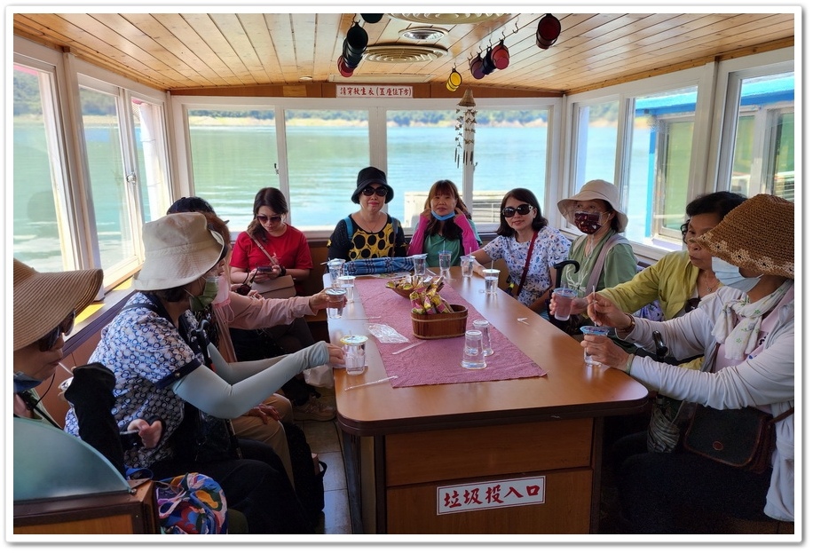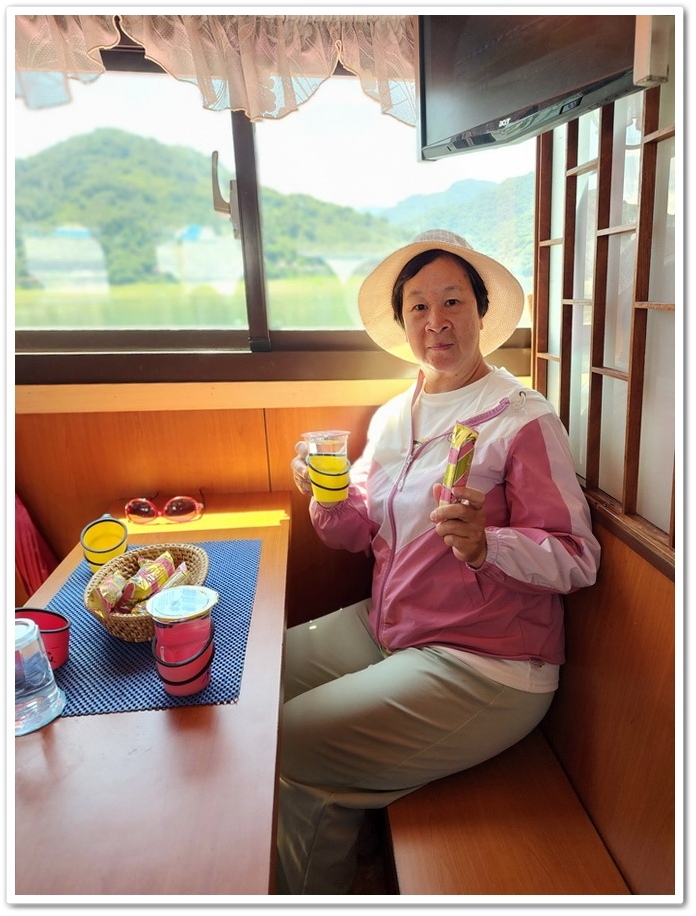 搭船遊湖不單只是搭船而已,遊艇業者還提供餅乾及杯水讓遊客不限續吃,真的是有夠貼心!船長還一邊開船一邊講解給我們聽,配合電視螢幕上的照片,講解更一目瞭然!