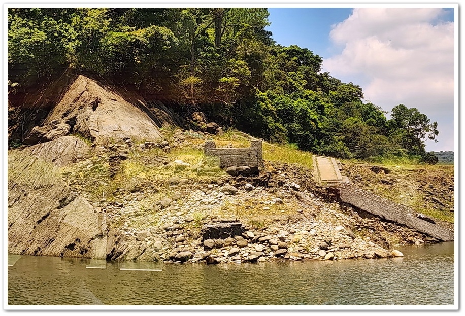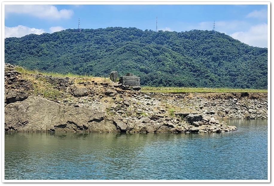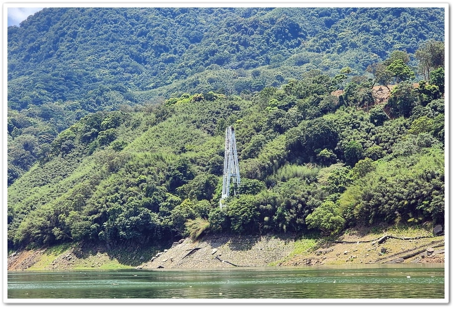 ▲ 長興斷吊橋。為了活絡『石門水庫』南北兩岸的交通與觀光,曾在『阿姆坪碼頭』和『長興村』之間興建一座吊橋,於民國七十三年三月完工,不料在啟用前夕遭強風吹毀,而後又未修復;現今在『阿姆坪碼頭』搭船遊湖,還可看見對岸的橋塔遺跡,據說遭逢大旱時,還能看見乾涸的水庫底下露出坍塌的吊橋殘骸