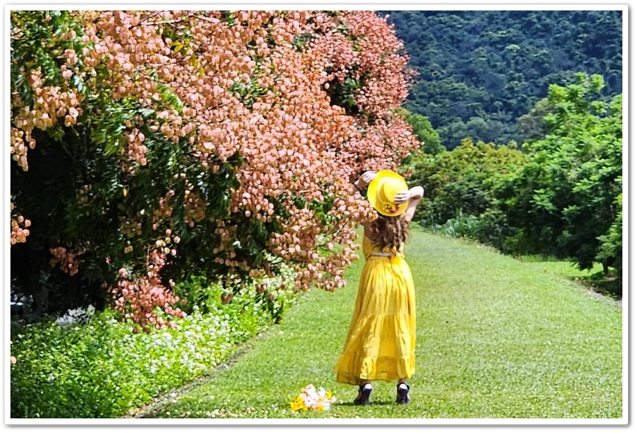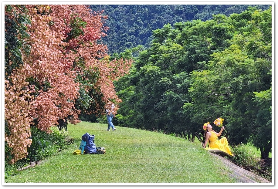 我們剛到南投埔里『內埔飛場』時,就有一位網紅在這裡拍照,穿著黃色網美服裝擺著妖嬌的Pose,攝影師則拿著長筒大砲在堤防下拍照,背影看起來好美喔!但請千萬不要回頭啊!我寧願欣賞背影就好!