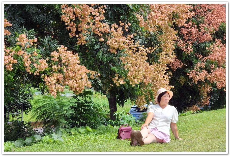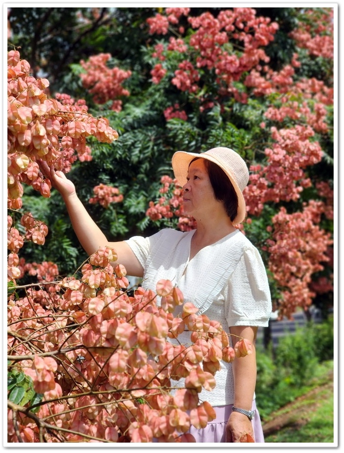 台灣欒樹的花朵,因為要有足夠的陽光,所以通常花朵都長在樹的頂端,如果植株太高的話,在樹下就不容易拍得到,有時候走在欒樹下還不知道上方這麼精彩,所以一般很多人都會用無人機拍攝,但無人機就無法同時拍人與花朵,而這裡有堤防剛好與花樹同高,所以就成為很好拍照的景點
