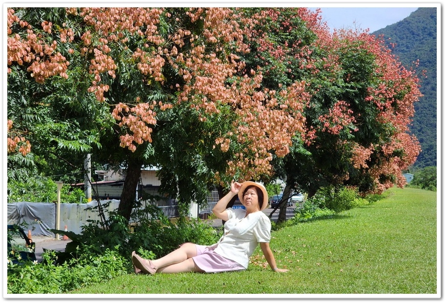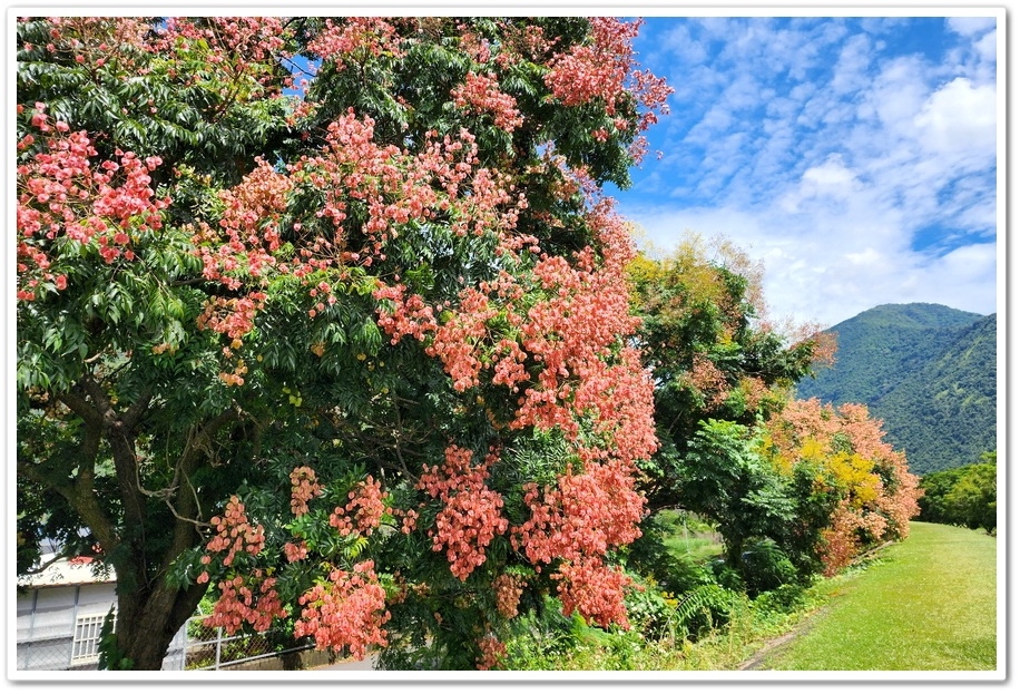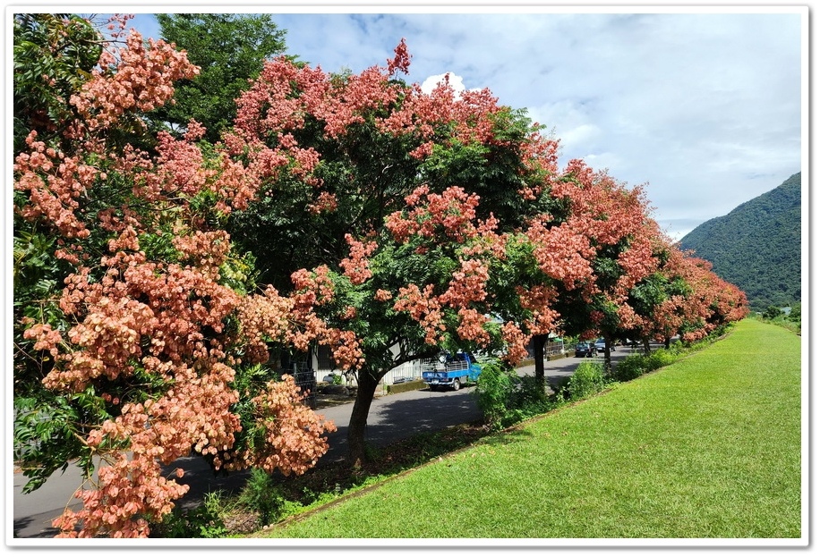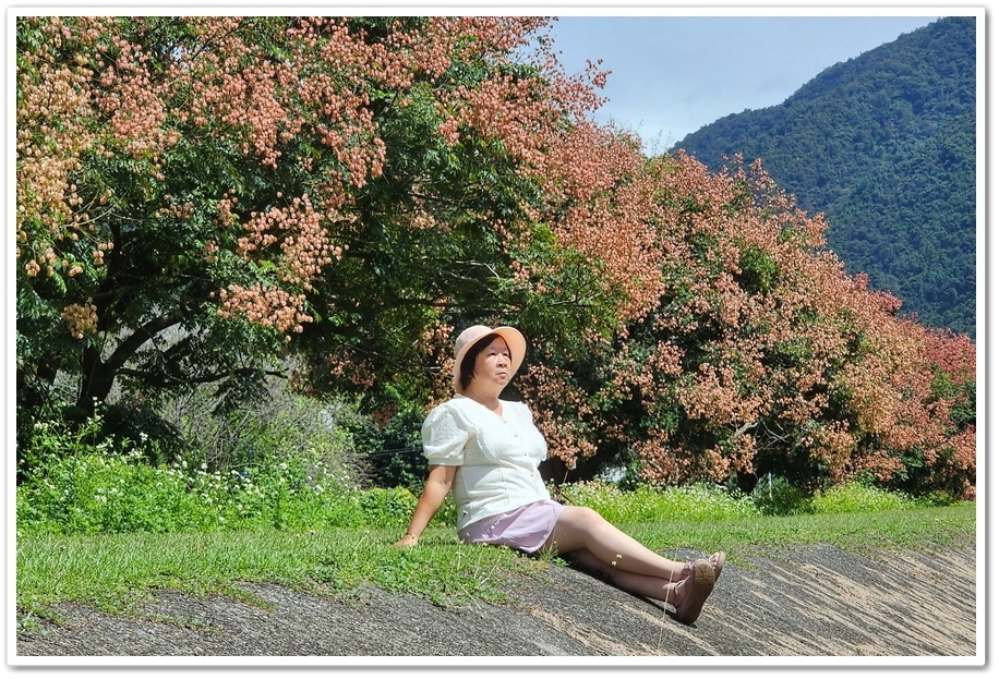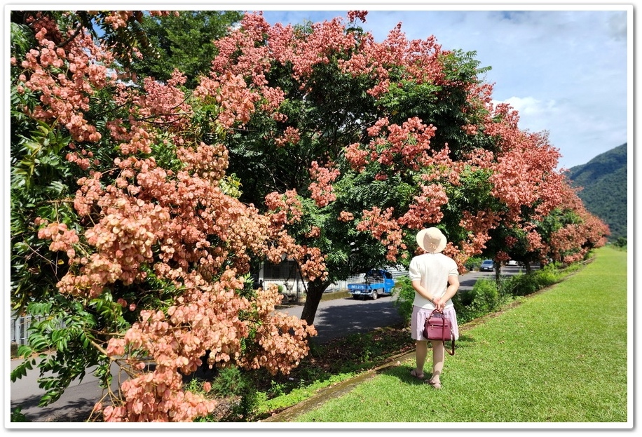 整排堤防欒樹綿延距離長,不僅看起來相當壯觀,更能讓人近距離賞拍花海環繞美景,取景時可從堤防下往上拍攝,將欒樹及後方山景或藍天一同入鏡,也可到樹底下以枝葉為前景,捕捉唯美人像特寫,若有空拍設備則可拍出長排延伸感場景