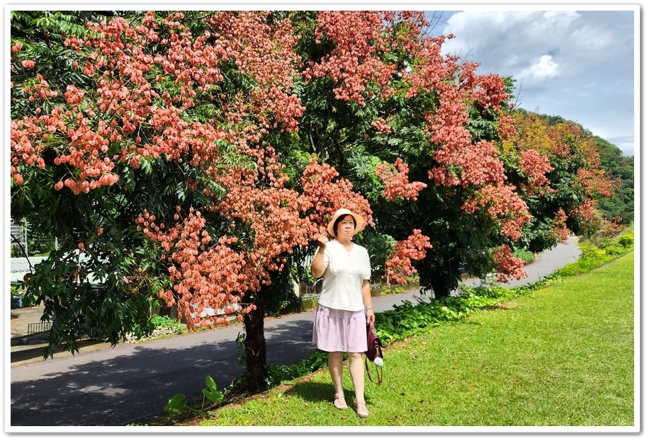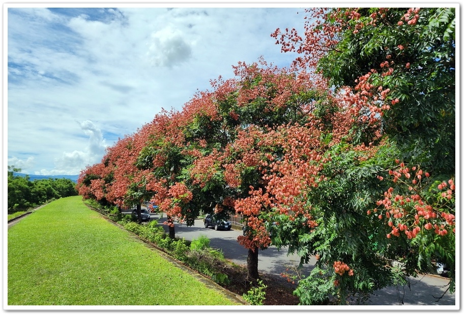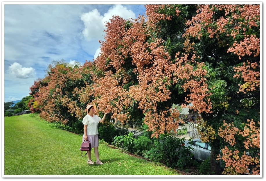 我們曾經於2021年4月來『內埔飛場』拍攝藍花楹,今年9月25日則是來『內埔飛場』拍攝台灣欒樹,藍花楹樹是種在堤防外側的『眉溪』旁邊,而台灣欒樹則是種在堤防內側的『內埔路』上,中間由堤防隔開,所以站在堤防上拍照,很容易與花同框