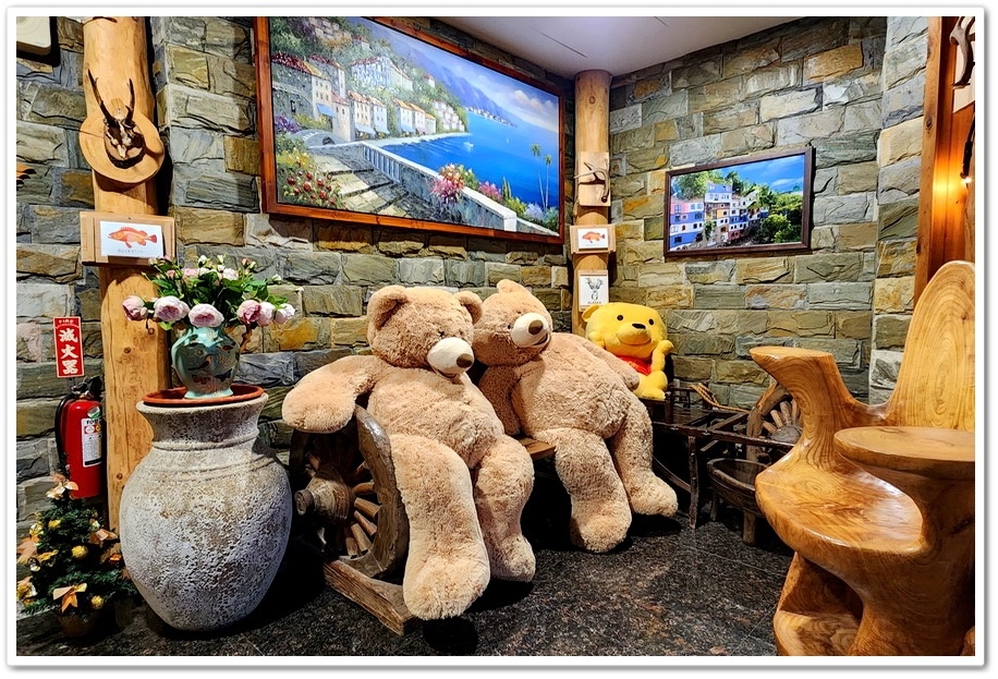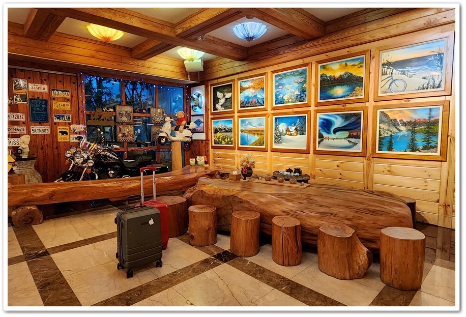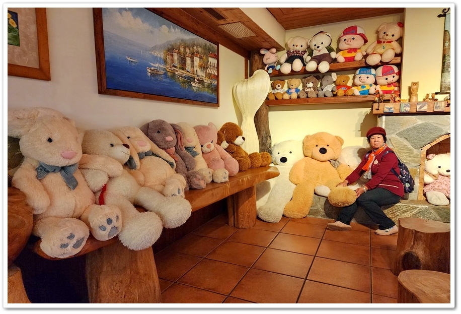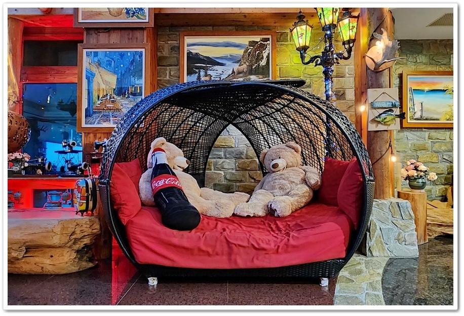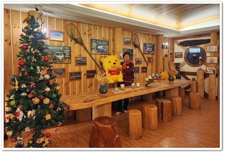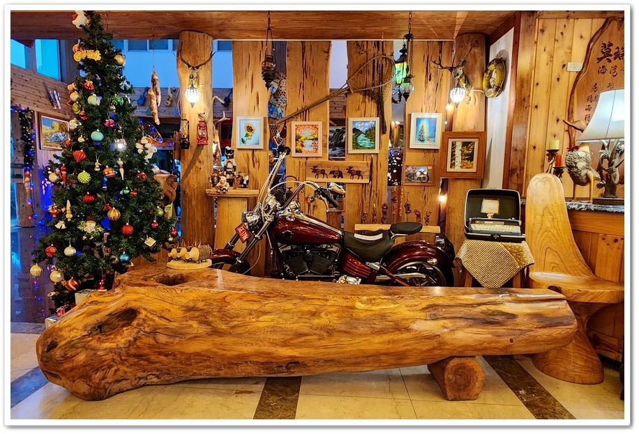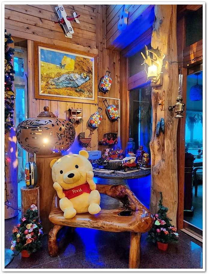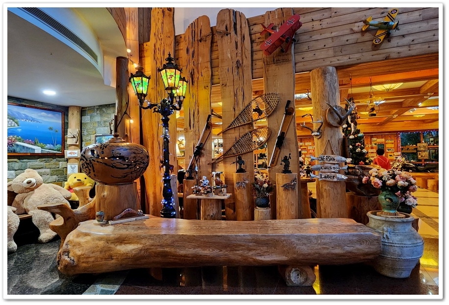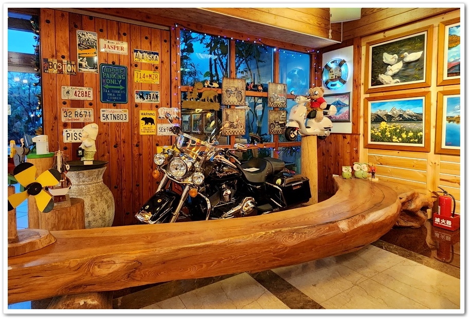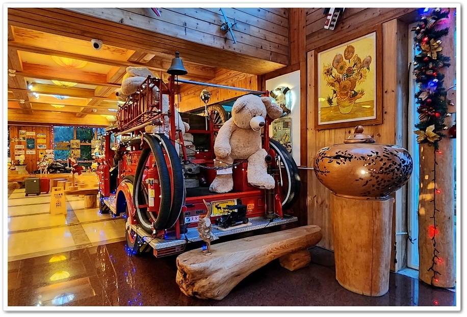 渡假會館內使用大量的檜木頭,不管擺飾或裝潢都是使用木頭,讓人很有北歐的感覺,加上重機、消防車,各種藝術品,走道還有油畫欣賞,以及一間收藏著滿屋子的小熊,小熊有大、有小,據說這些都是老闆從國外帶回來的收藏品