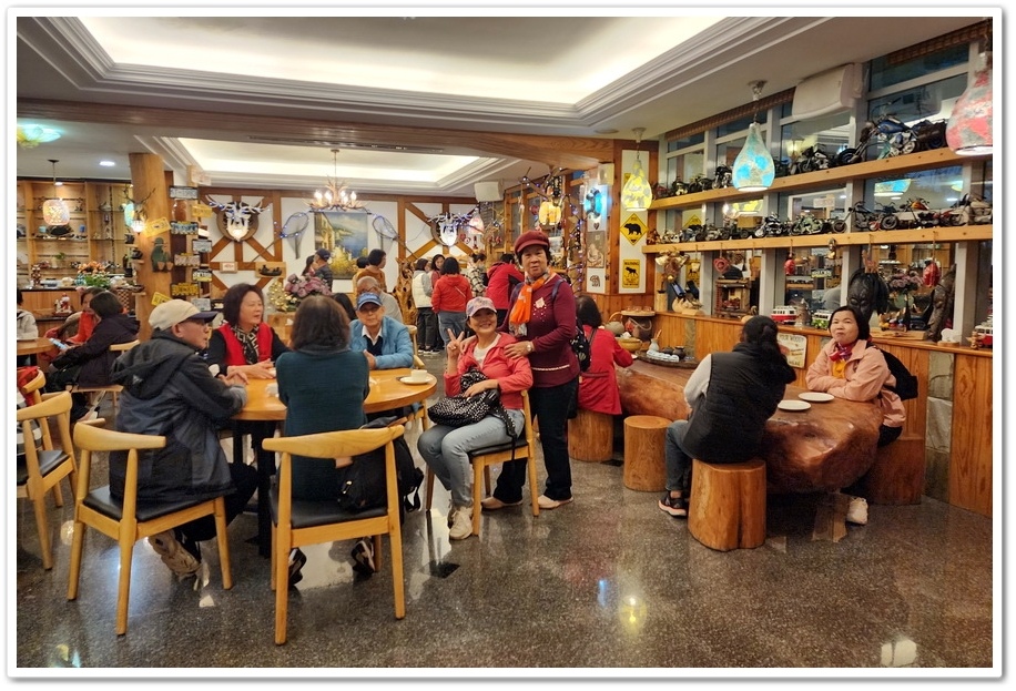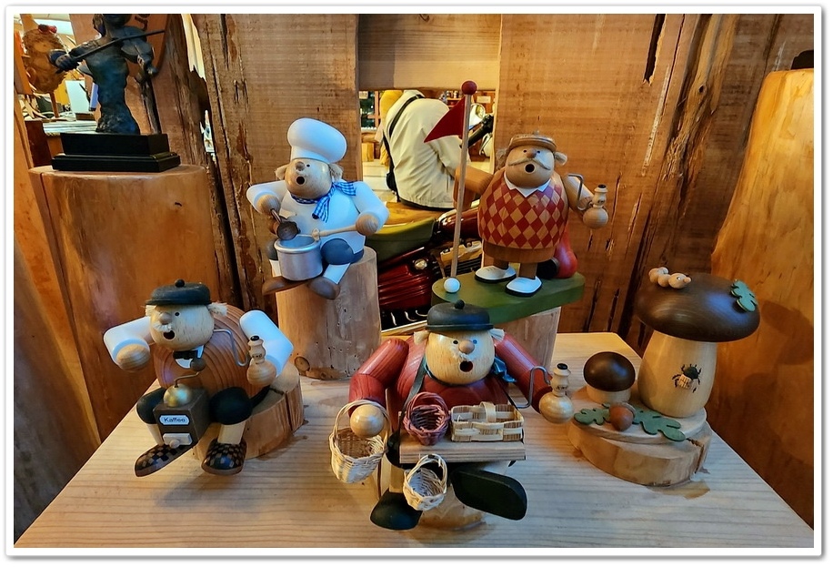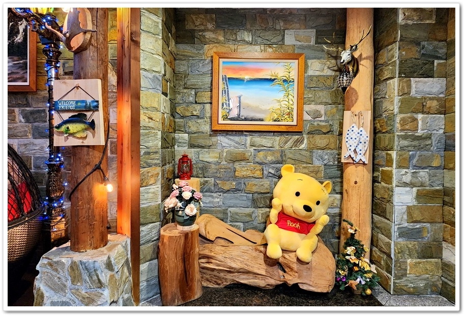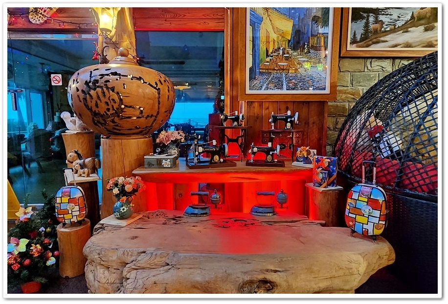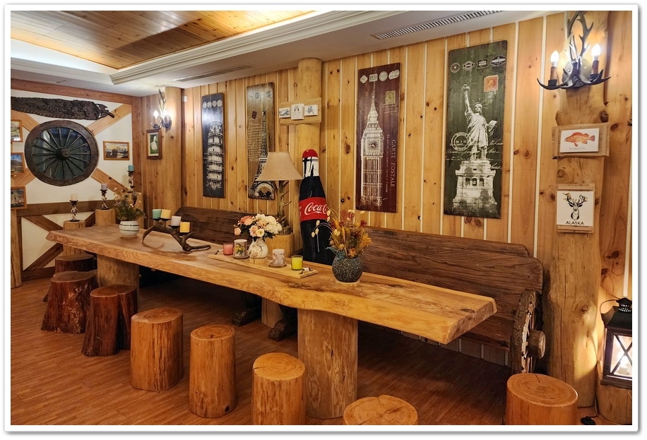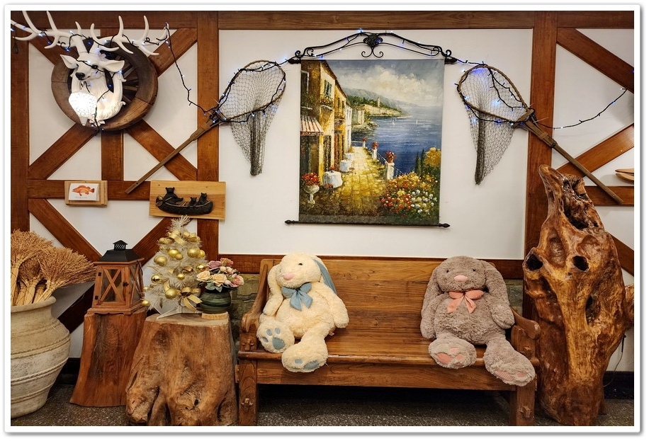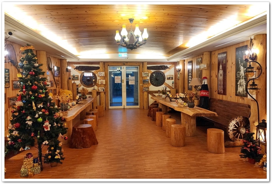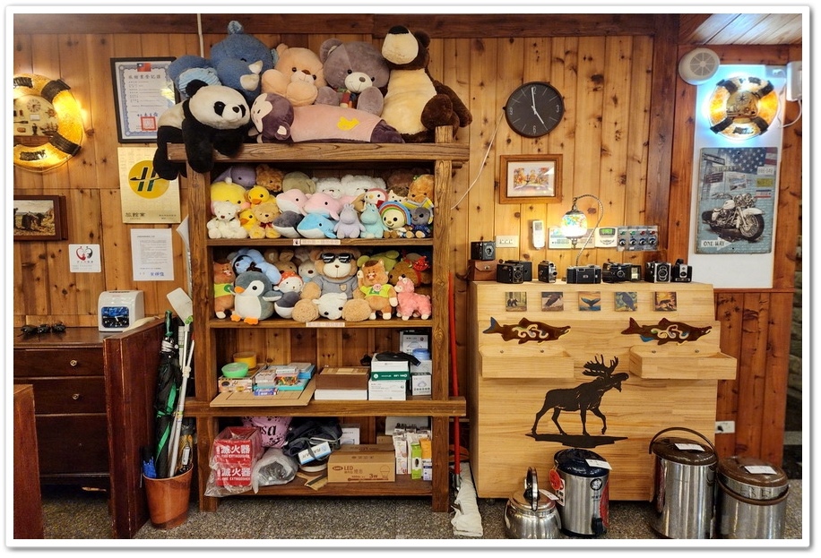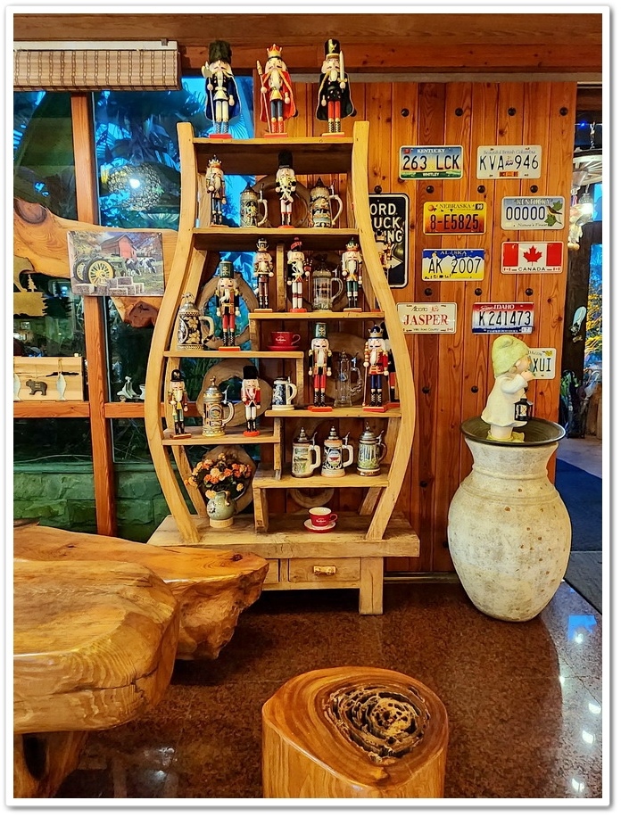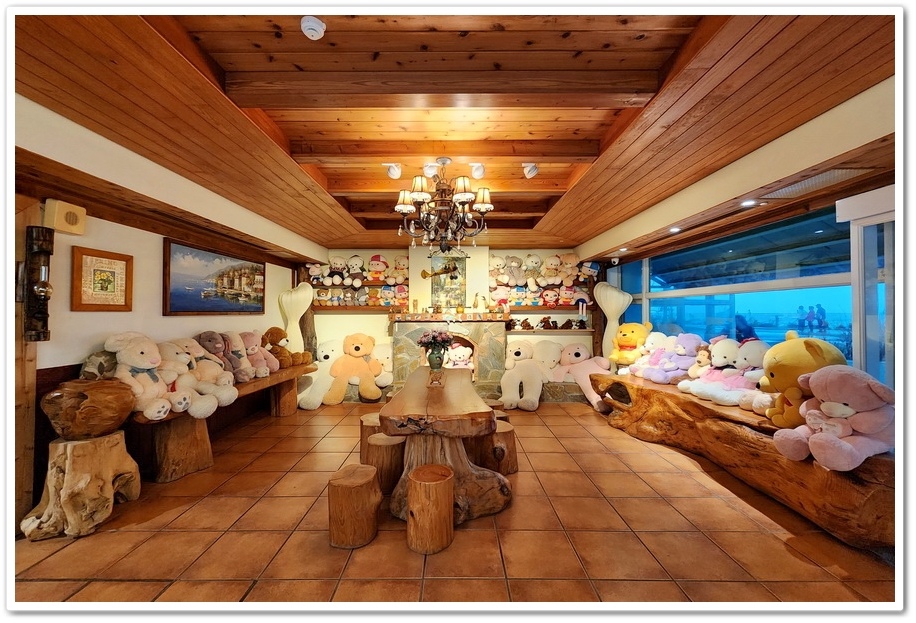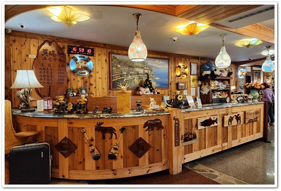 渡假會館內使用大量的檜木頭,不管擺飾或裝潢都是使用木頭,讓人很有北歐的感覺,加上重機、消防車,各種藝術品,走道還有油畫欣賞,以及一間收藏著滿屋子的小熊,小熊有大、有小,據說這些都是老闆從國外帶回來的收藏品