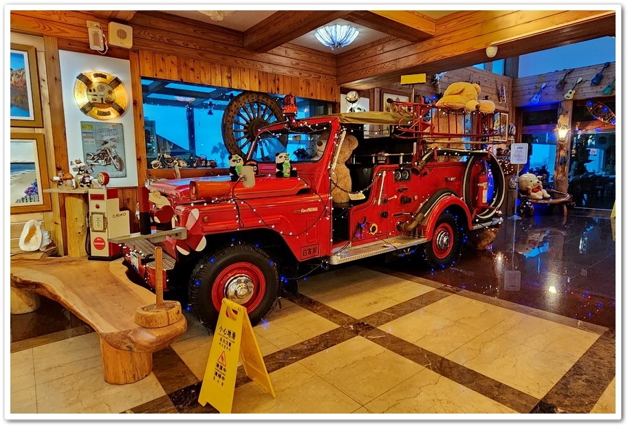 ▲ 這間『莫瑞納海灣會館』讓我們全團驚喜連連,光是在接待大廳就擺滿各式各樣的收藏品,會館人員簡報一結束,我們隨即展開拍照模式,這個要拍、那個也要拍!簡直是拍到手軟也不為過!而最吸睛的就是上圖這輛紅色消防車,加上LED燈後閃閃發亮!