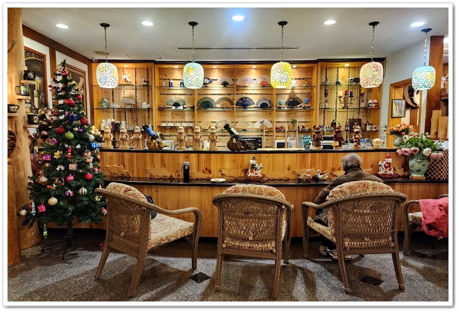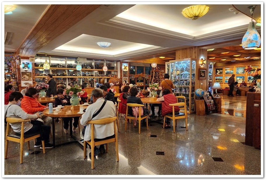 我們邊喝咖啡、邊欣賞藝品,會館的接待櫃檯,和大型飯店簡潔俐落風格不同,卻也和商務旅社、民宿的招待櫃檯不同,原木打造的櫃檯和裝潢,壁面上掛著一幅海灣美景圖,看起來就是很有溫度感,就如家中某一處的角落