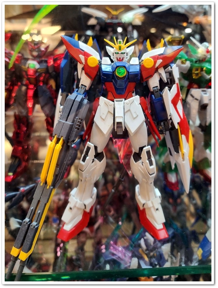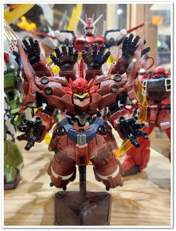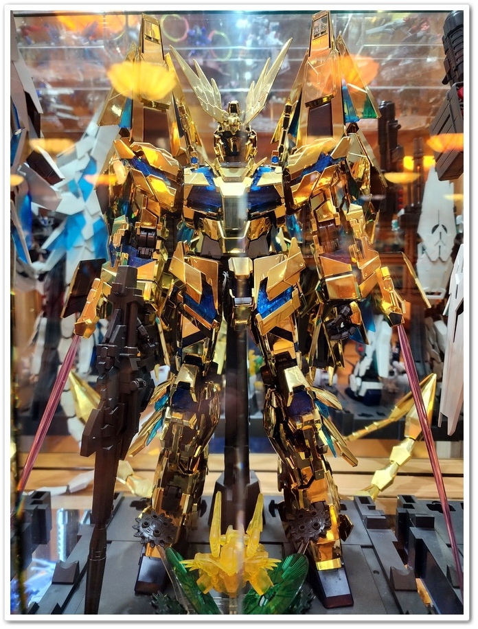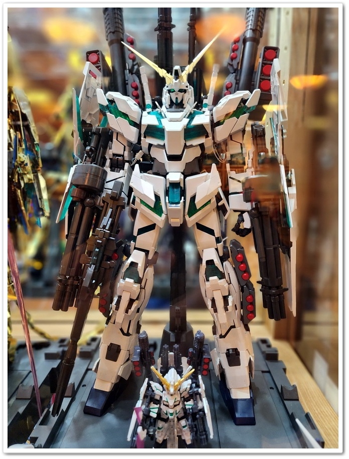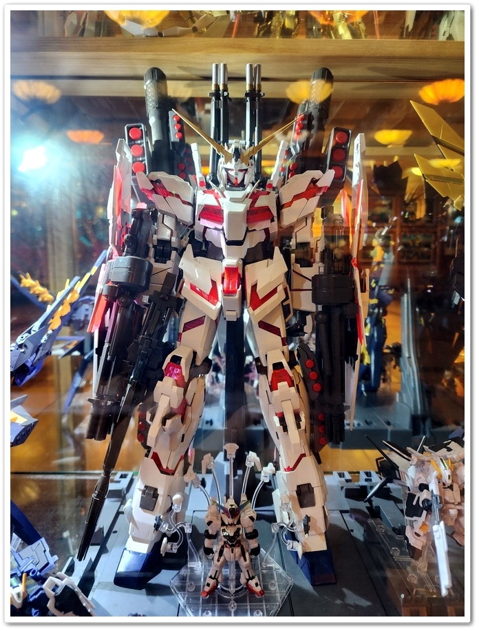 ▲ 在接待大廳的中柱上,裝潢成一個四面的玻璃櫥窗,每一面、每一層也都擺滿了鋼彈機器人,例如這HGUC 全武裝獨角獸高達(毀滅模式)BB戰士全武裝獨角獸高達,出自『機動戰士高達UC episode 7 彩虹的彼方』的『全武裝獨角獸高達』在HGUC系列上登場。精神感應框架用透明綠成形。還內附3枚盾牌用的支架,能夠擺出模型才有的展示