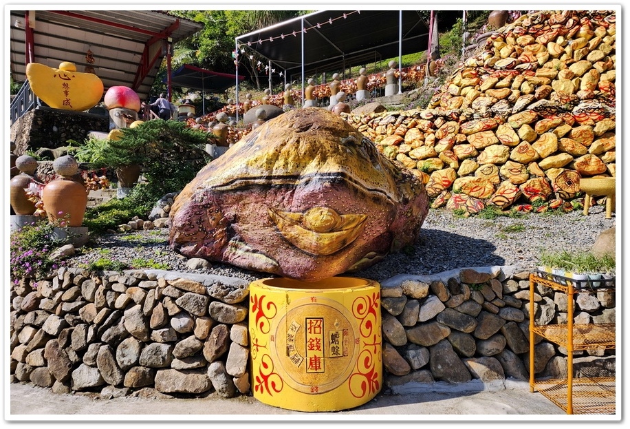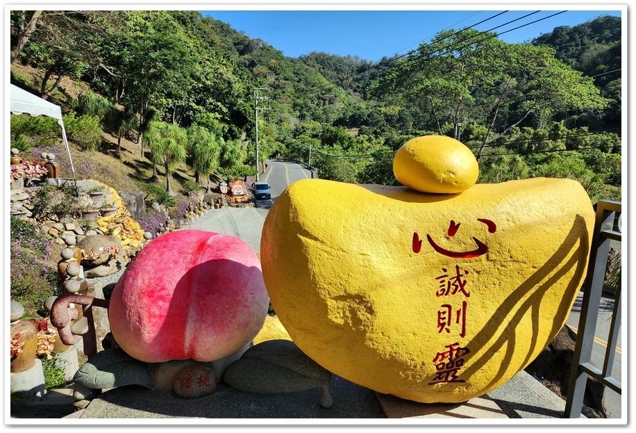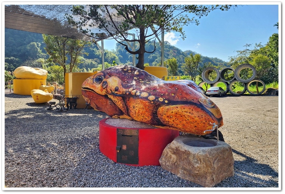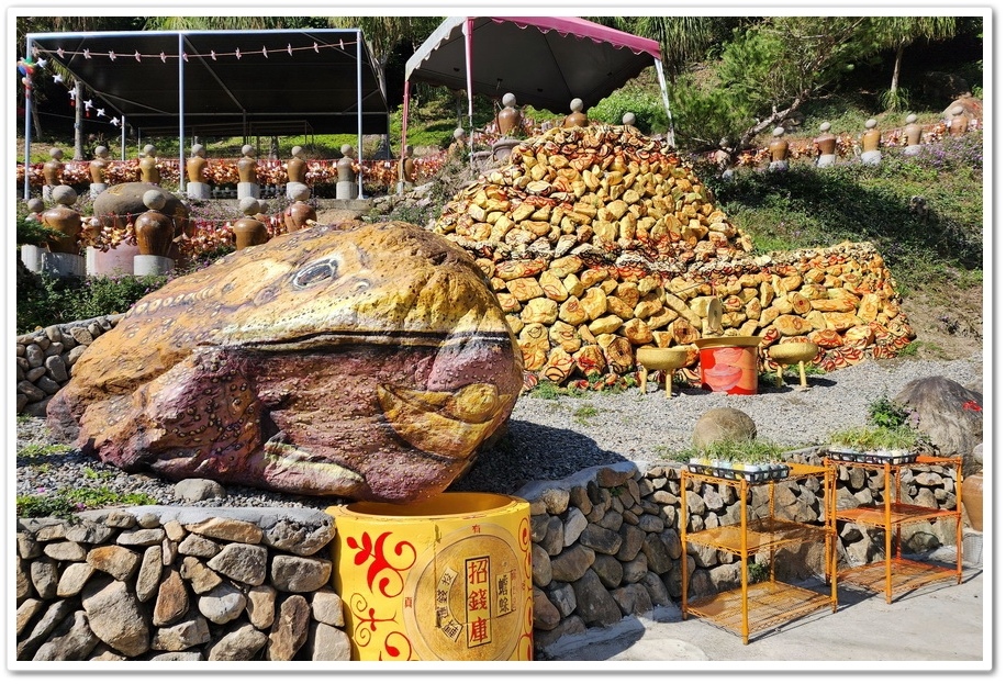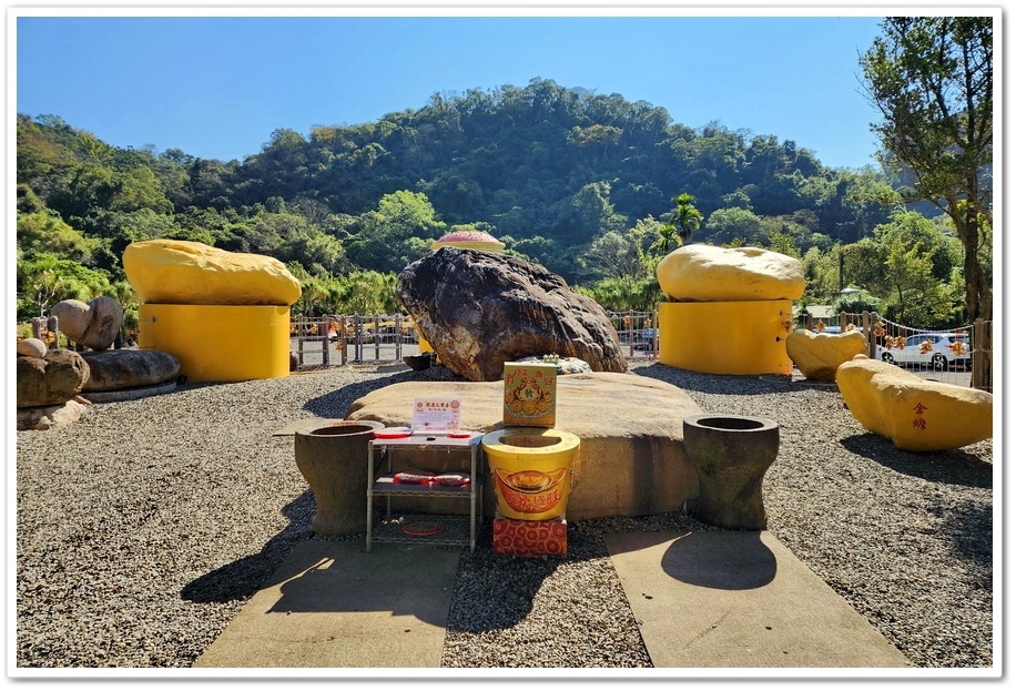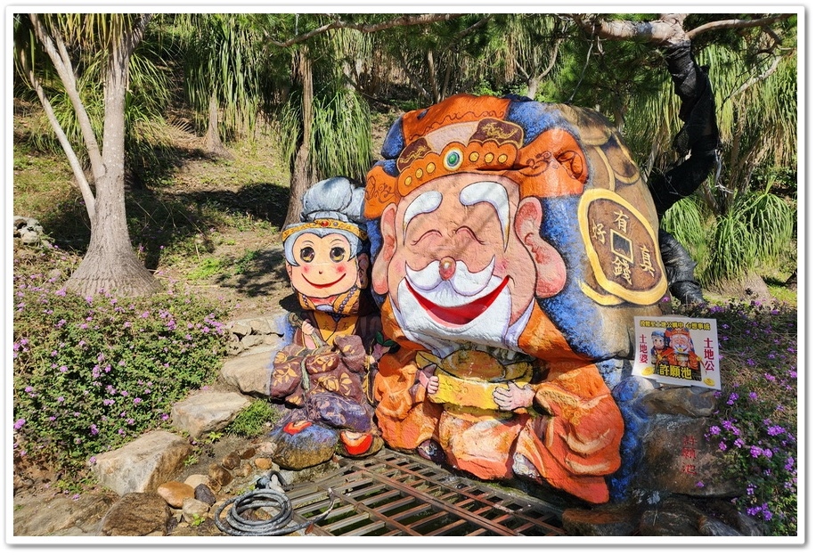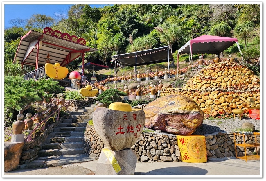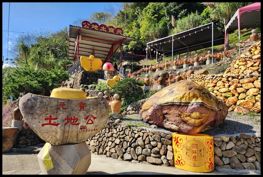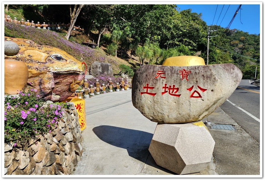 這裡不但風景優美,還有許多奇岩怪石,在停車的地方就有夫妻石,2個笑臉非常可愛,還能許願呢!金蟾蜍也是超逼真,就在邊坡草地上。走上幸福祈福步道階梯,就能到達上方的『元寶土地公廟』