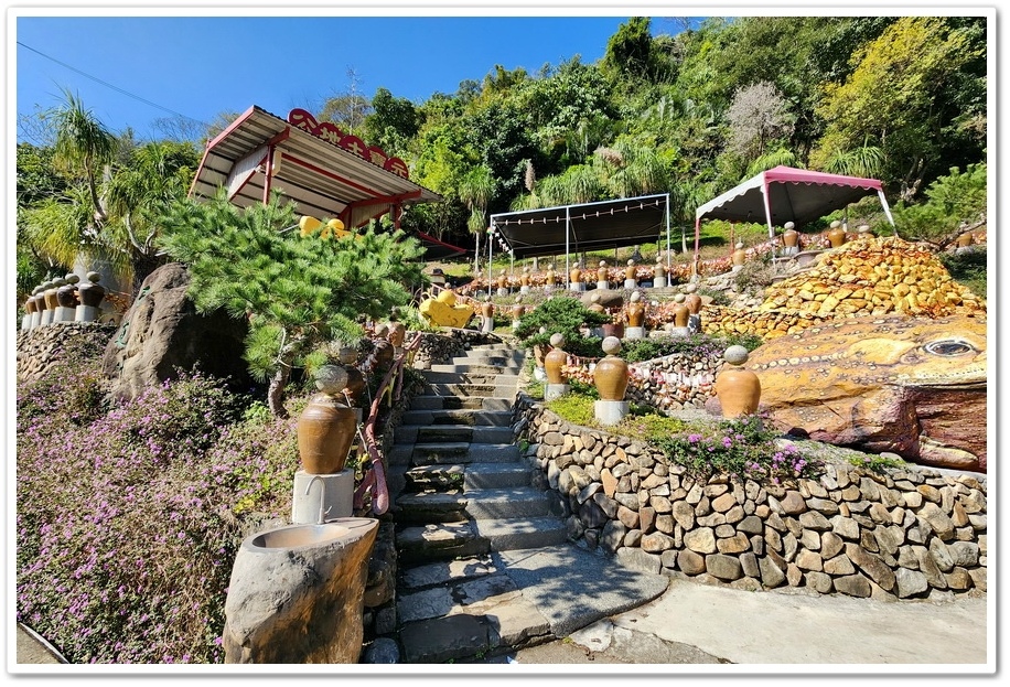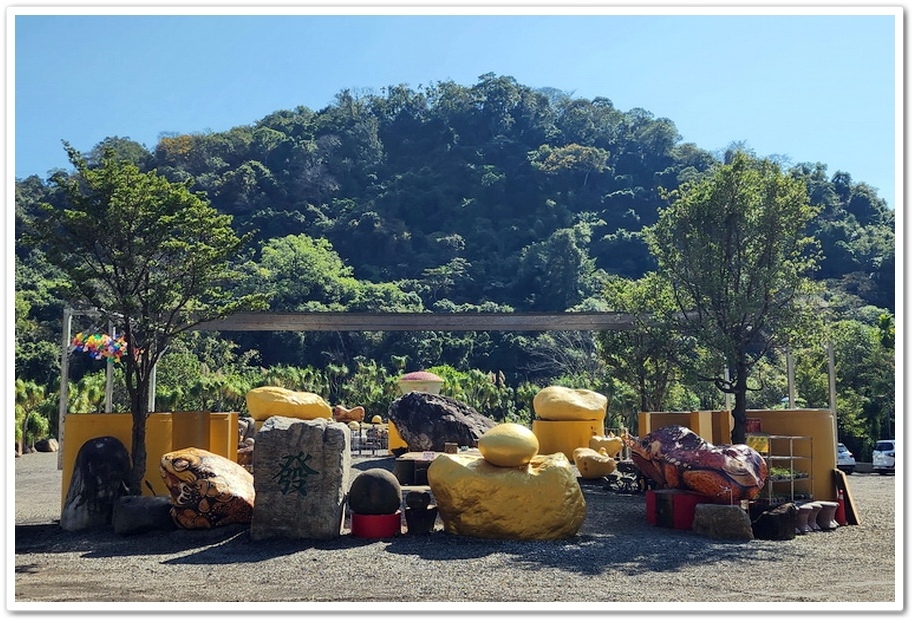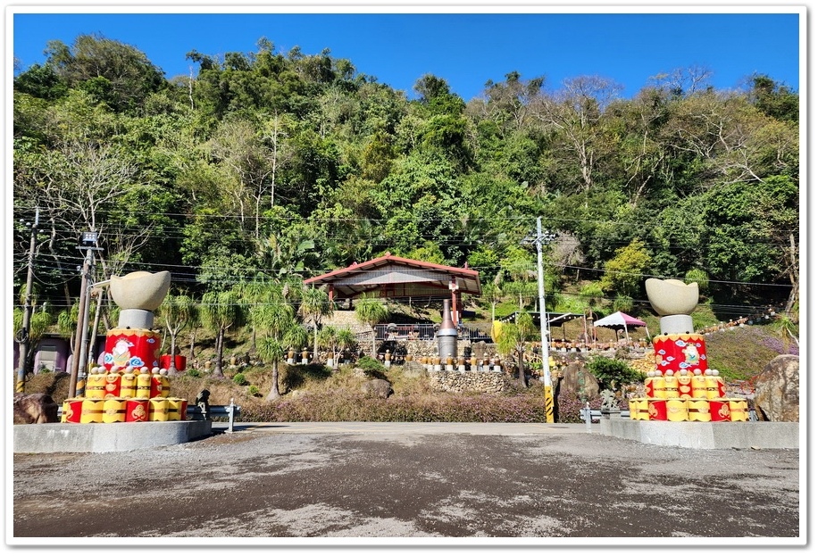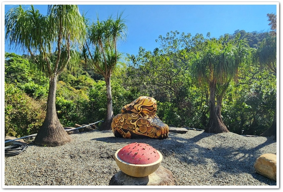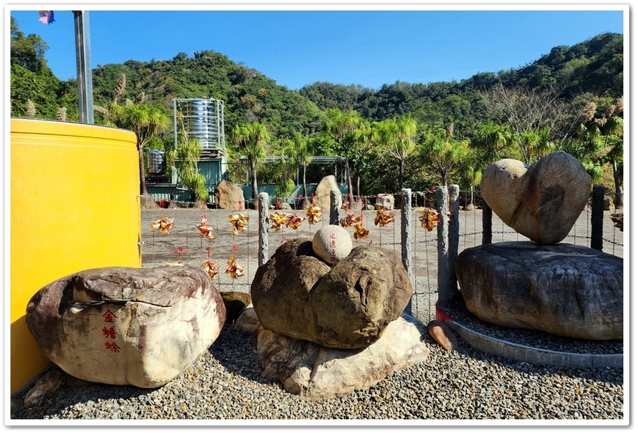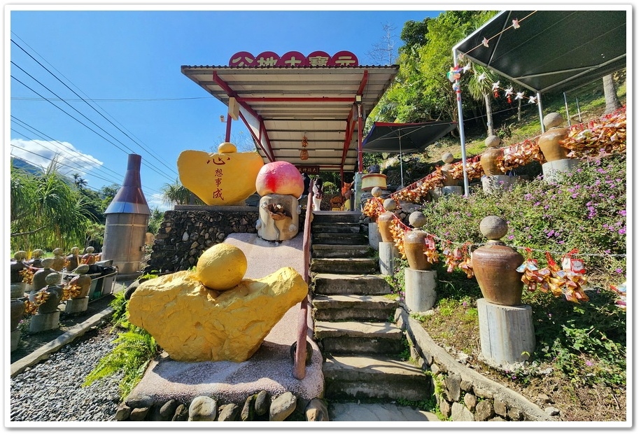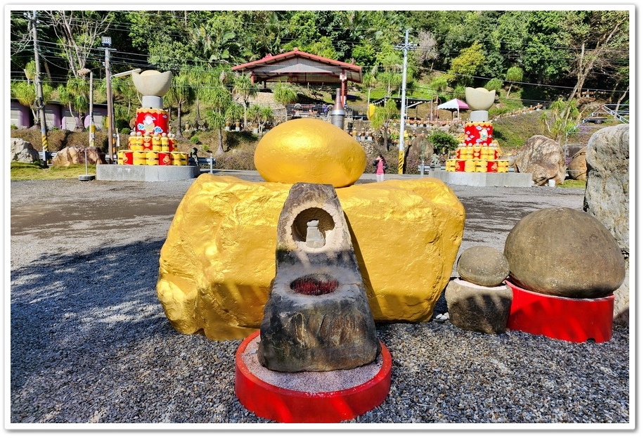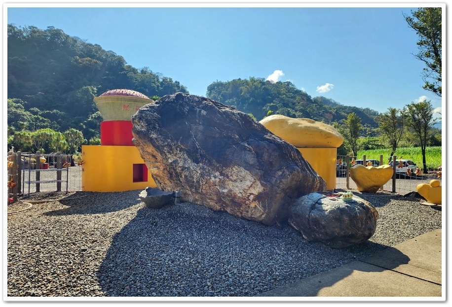 這裡不但風景優美,還有許多奇岩怪石,在停車的地方就有夫妻石,2個笑臉非常可愛,還能許願呢!金蟾蜍也是超逼真,就在邊坡草地上。走上幸福祈福步道階梯,就能到達上方的『元寶土地公廟』
