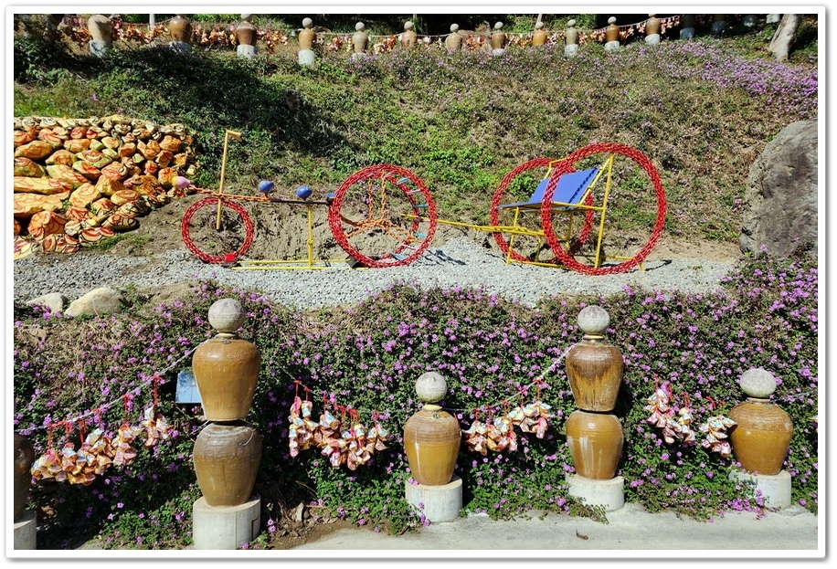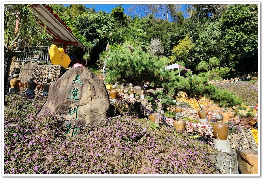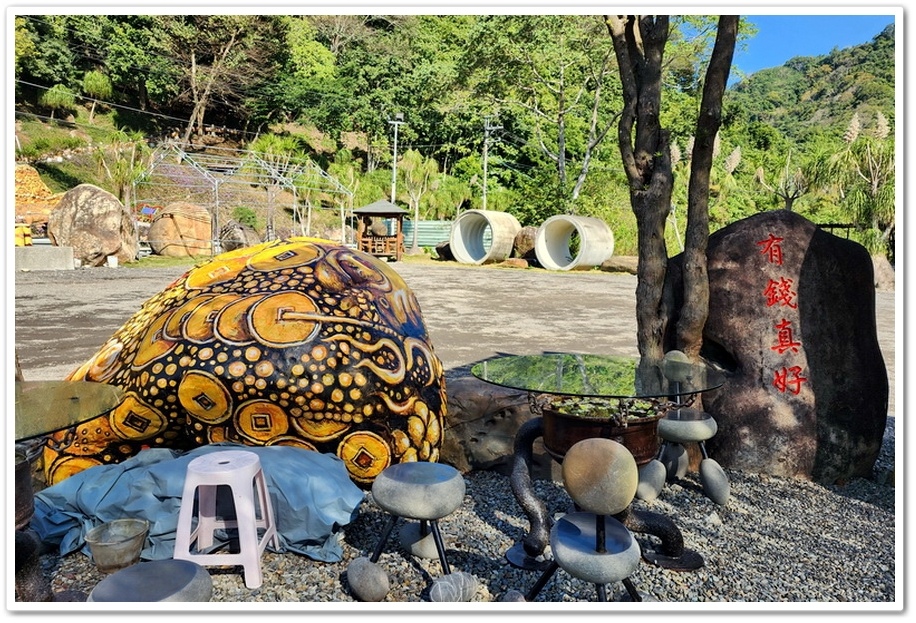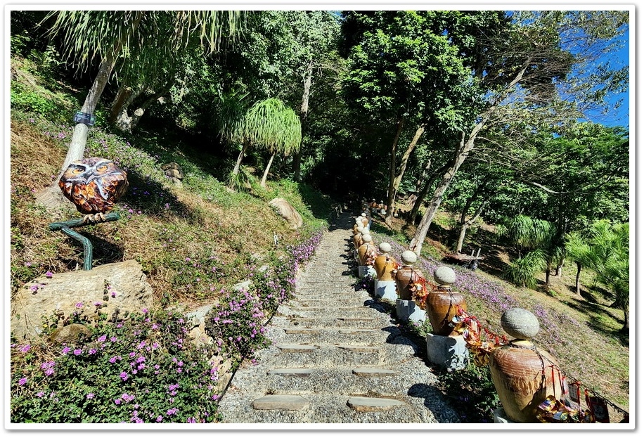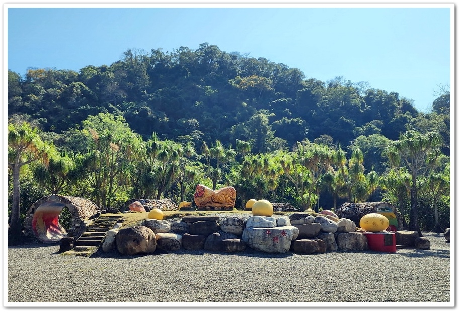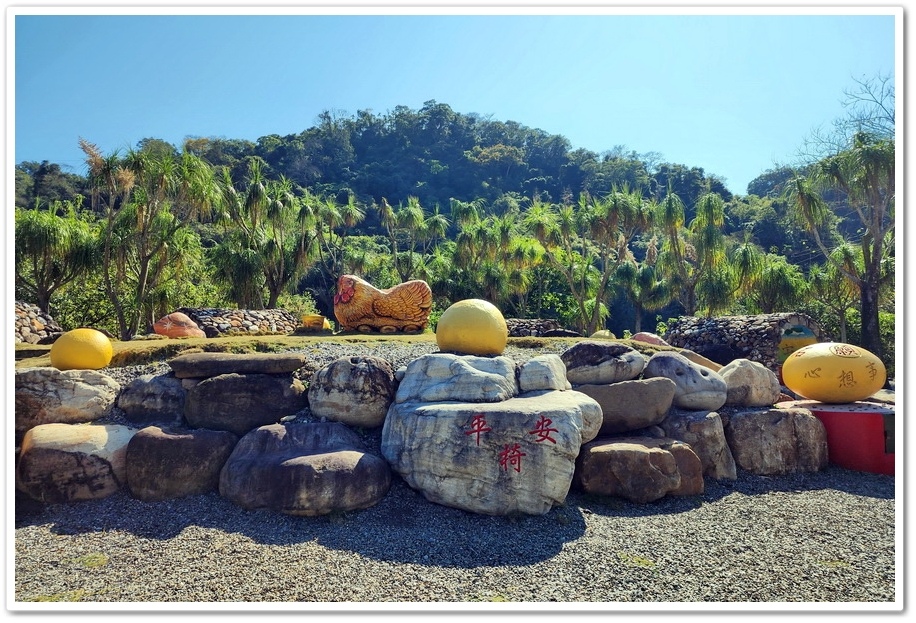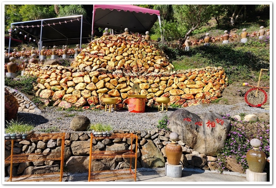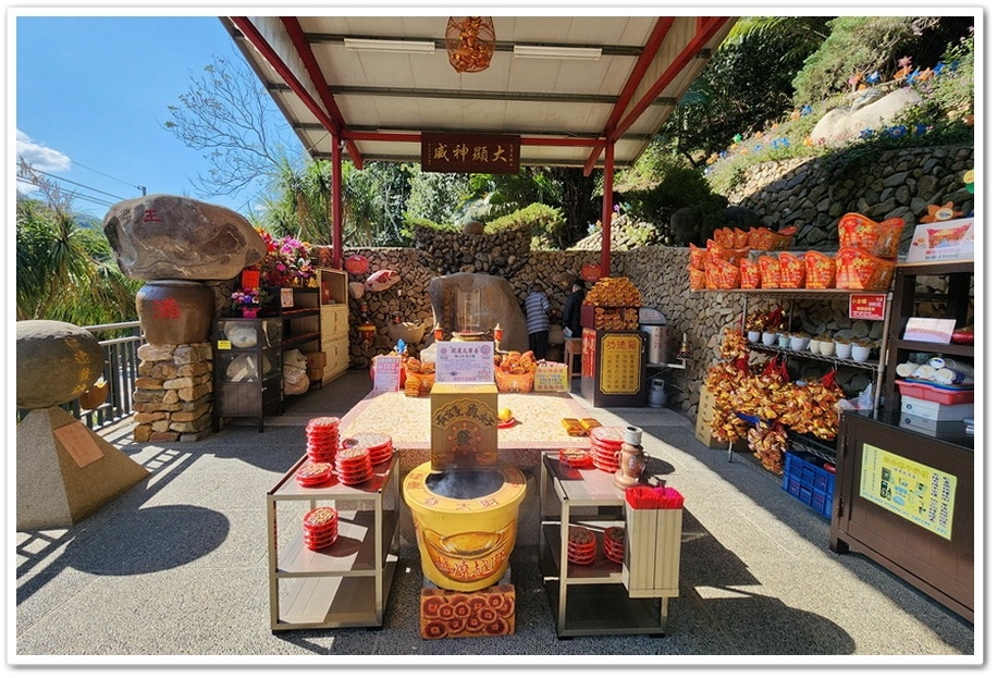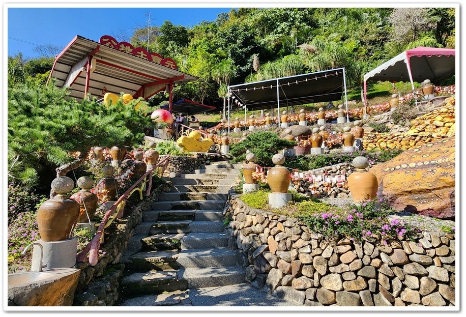 這裡不但風景優美,還有許多奇岩怪石,在停車的地方就有夫妻石,2個笑臉非常可愛,還能許願呢!金蟾蜍也是超逼真,就在邊坡草地上。走上幸福祈福步道階梯,就能到達上方的『元寶土地公廟』