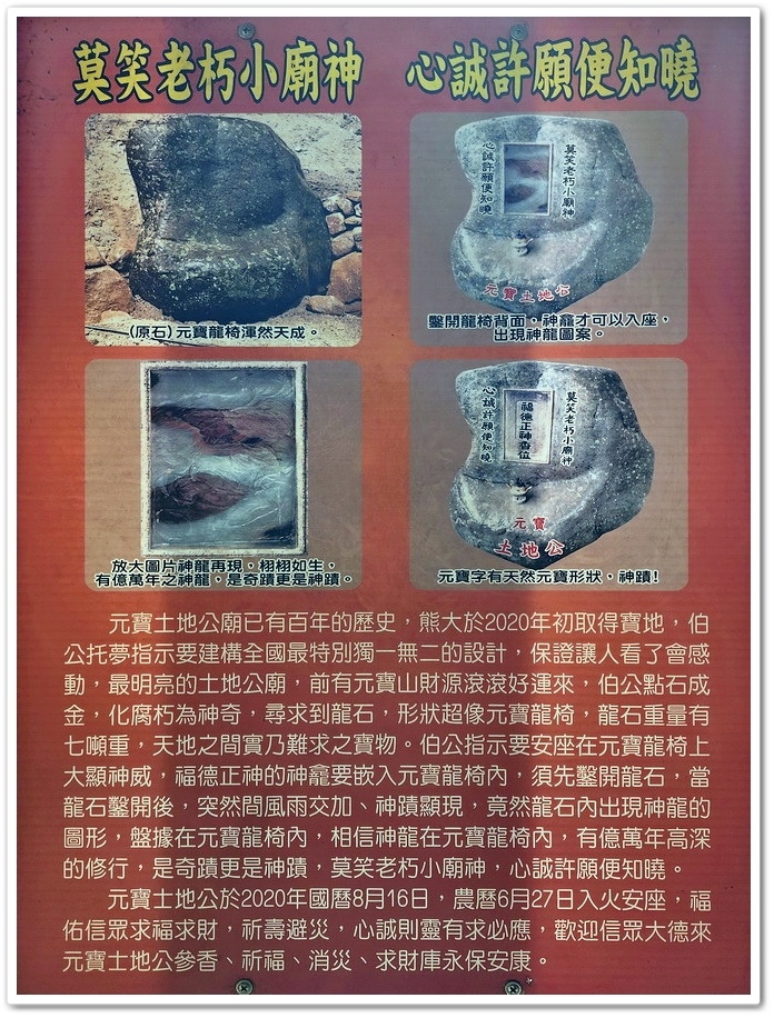 莫笑老朽小廟神,心誠許願便知曉。台中的『熊先生』於2020年購置此寶地,還購置一顆7噸重大石來鑲嵌原有的石碑神位,為了鑲嵌土地公石牌,切開石頭時,發現竟有不同色澤,乍看像龍紋,成了土地公座下『龍椅』