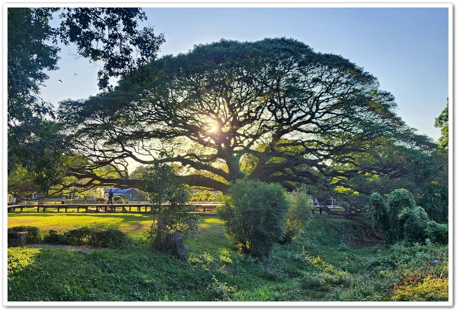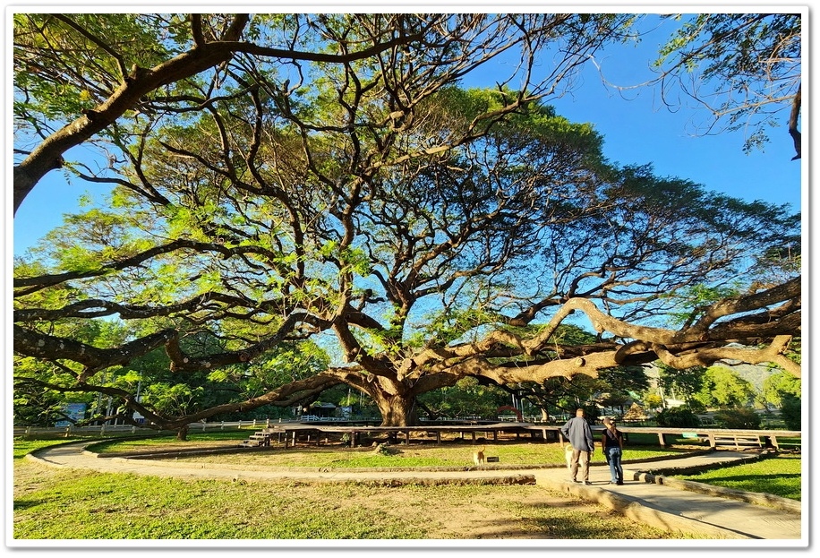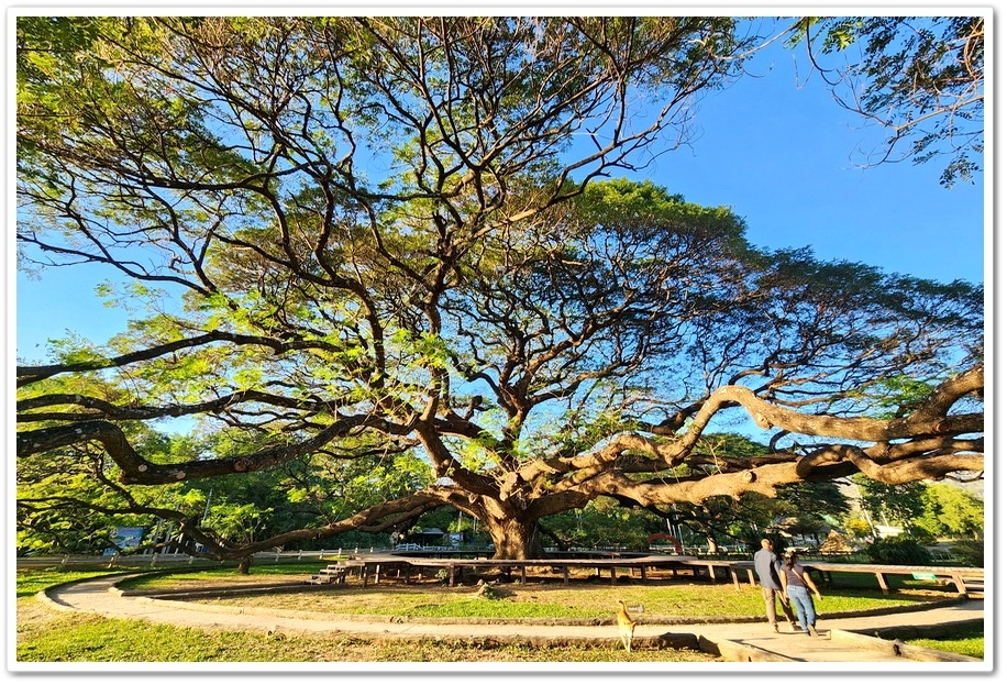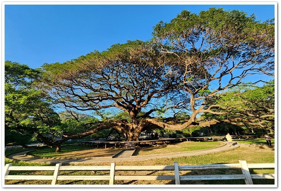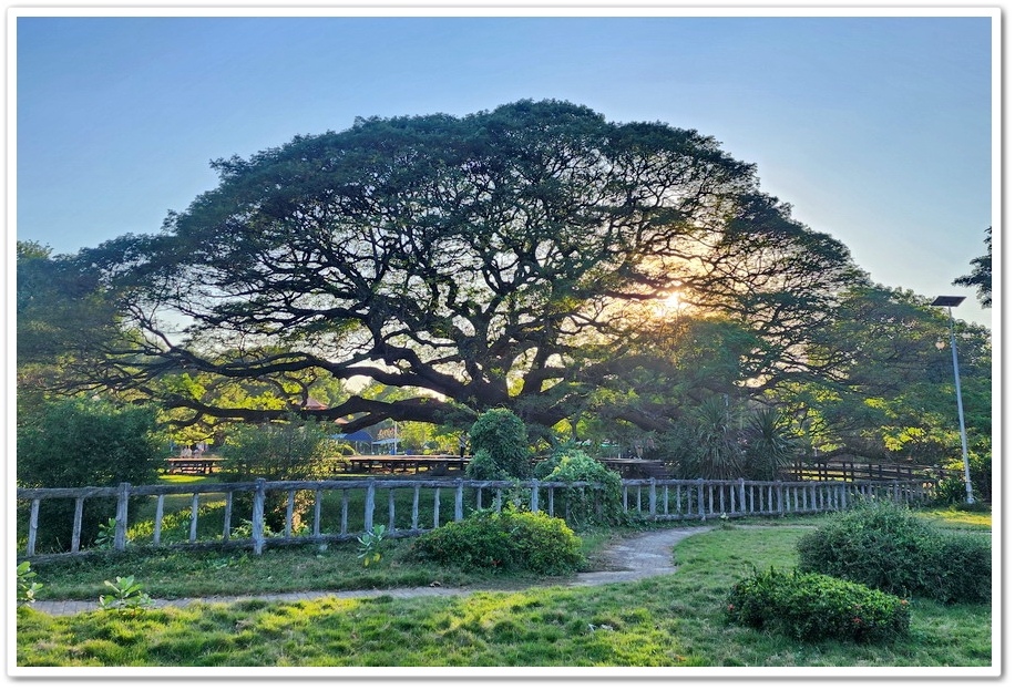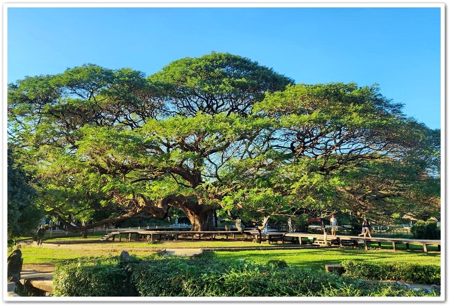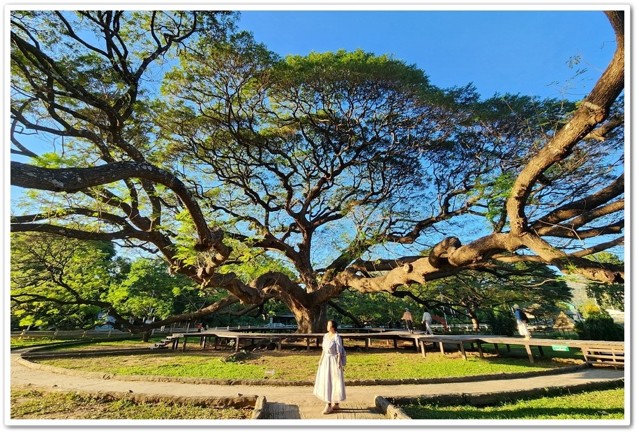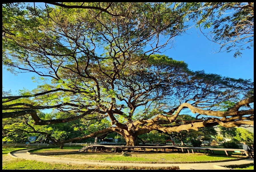 ▲ 走過商店街後,來到這裡就是『百年巨雨樹』,那麼『百年巨雨樹』有多大?我把相機廣角鏡頭開啟到最大,仍然無法將它全部入鏡,遠遠一棵巨樹佇立在公園內,外觀有點像某壽險廣告的大樹一樣!