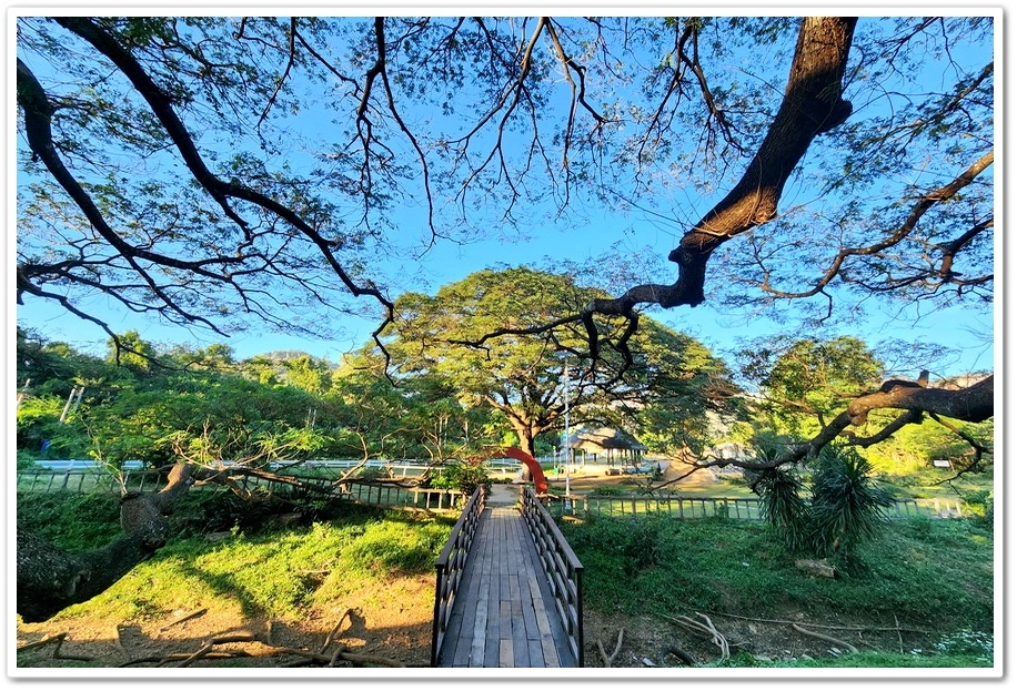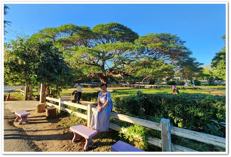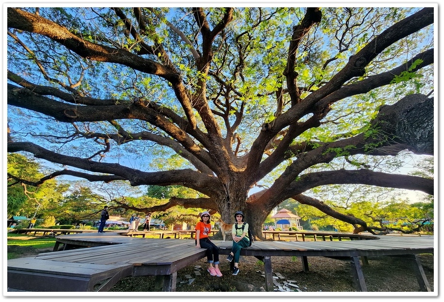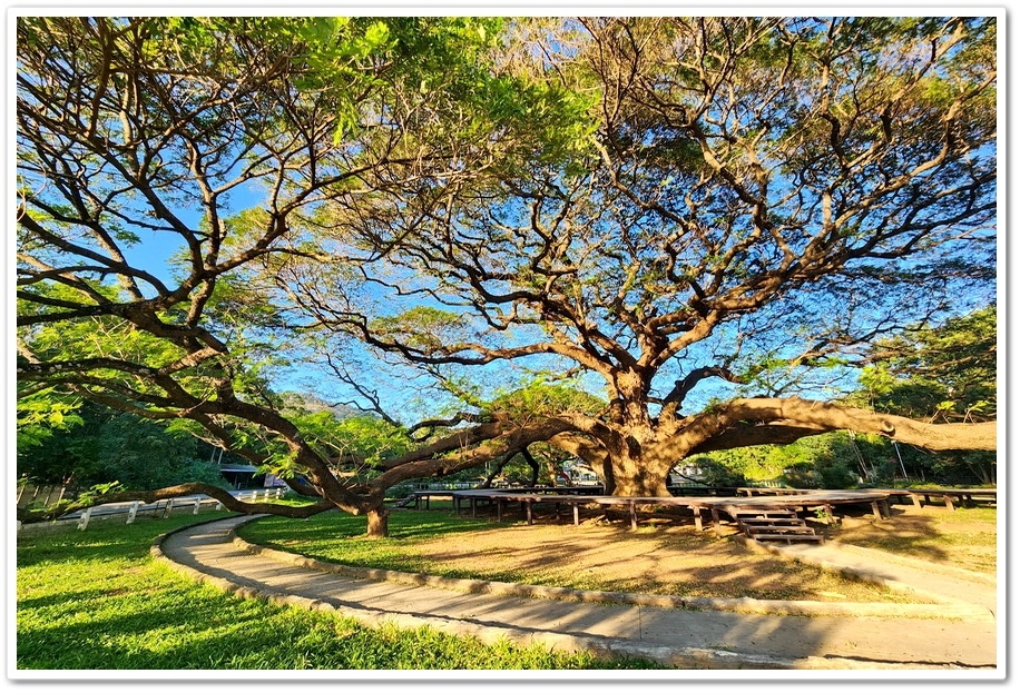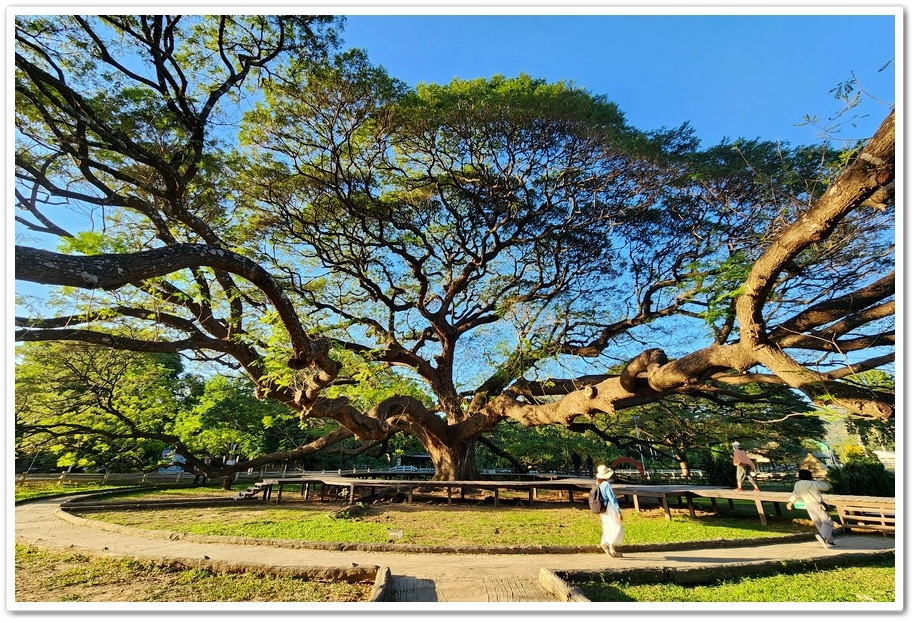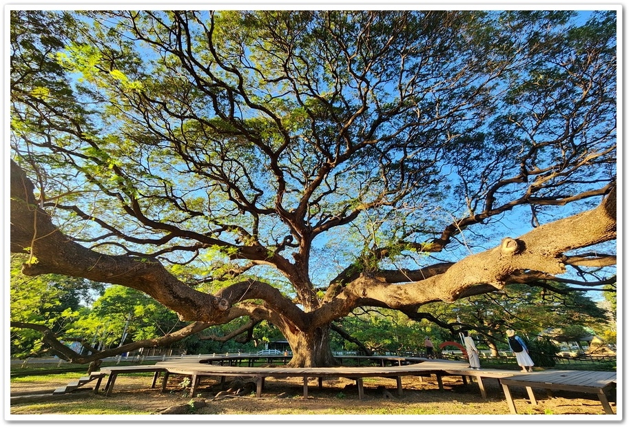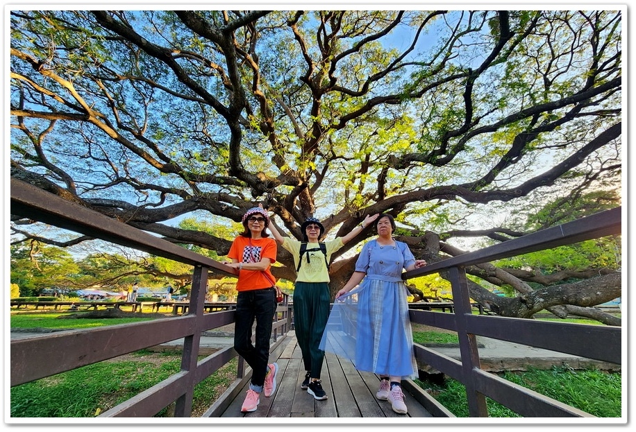 ▲ 走過商店街後,來到這裡就是『百年巨雨樹』,那麼『百年巨雨樹』有多大?我把相機廣角鏡頭開啟到最大,仍然無法將它全部入鏡,遠遠一棵巨樹佇立在公園內,外觀有點像某壽險廣告的大樹一樣!