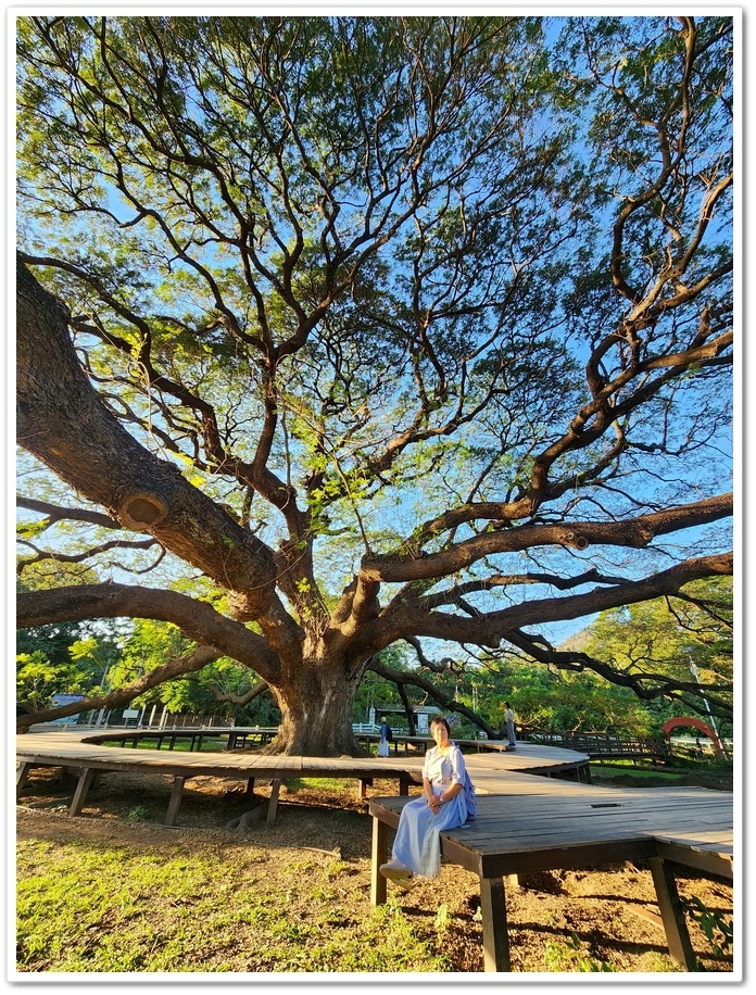 ▲ 這棵位於北碧府的『百年巨雨樹』,學名為『巨雨樹』,屬於『合歡樹』的一種。樹高達20多米,樹冠廣闊,環抱平均樹冠半徑25.87米,樹蔭直徑約51.75米,從地面到頂部的高度20米,由此可以想像它有多麼的巨大了吧!