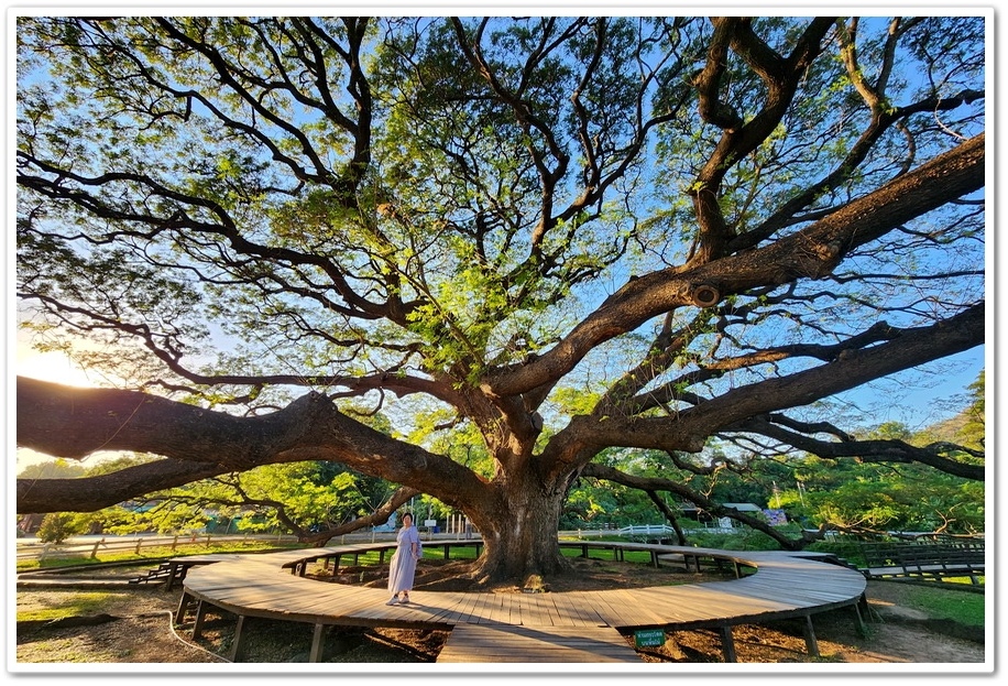 ▲ 泰國政府當局為了保護老樹及樹根的生長,已在大樹旁至樹幹建成一道圓形行人木橋,禁止踐踏樹根及樹幹附近的草地,防止善信刮樹及圍上彩布,因為當地人民相信巨樹有神靈附身,所以也禁止遊客環抱巨樹喔!