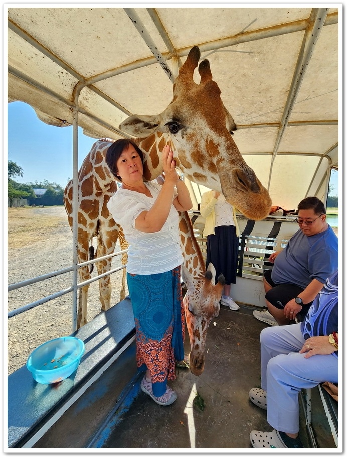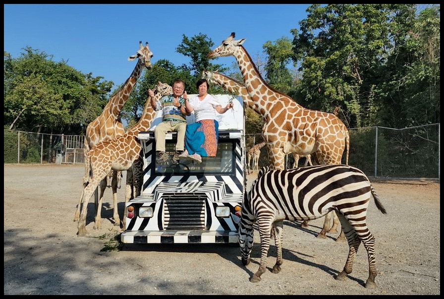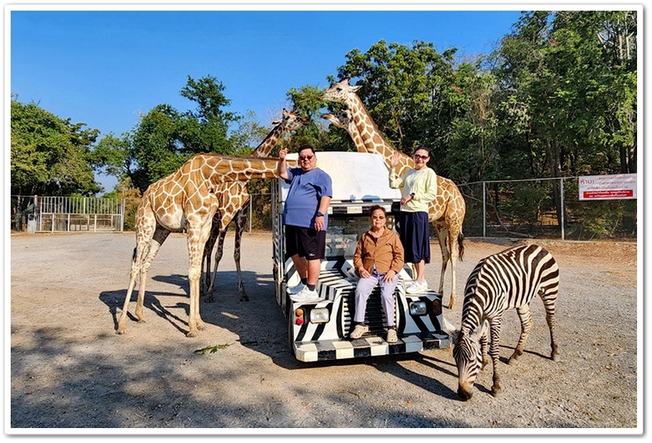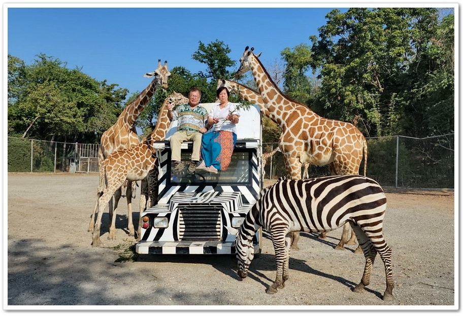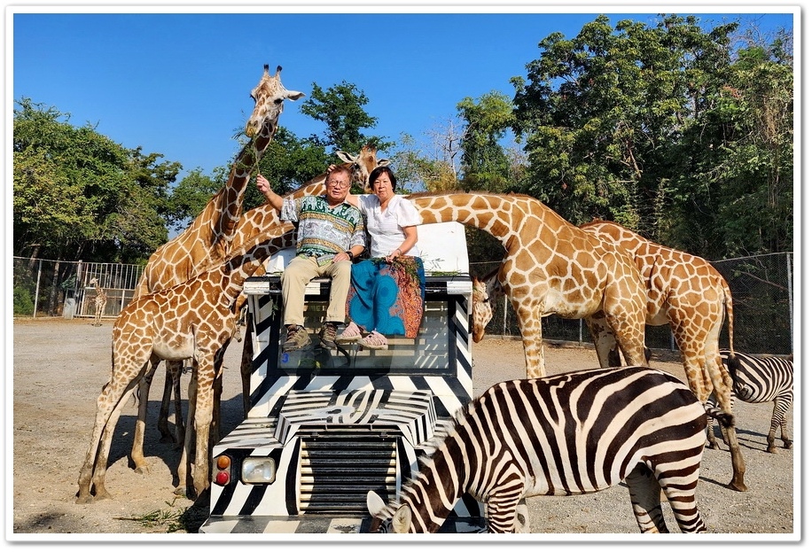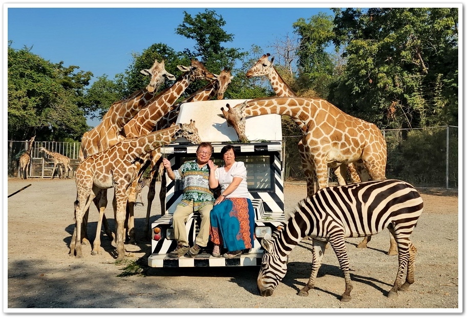 所以今天早上是旅遊『泰國』最具有驚嘆號的一天,因為今天早上我們要來參觀『北碧府野生動物園』,同時也是目前泰國最有人氣,最多人詢問的野生動物園!而今日本團包含我們兩個人在內的5個人,參加了『斑馬紋吉普車』專屬VIP網紅行程,每人1千元與長頸鹿近距離拍照,之後才再跟團搭乘遊園車進入動物園拍照!