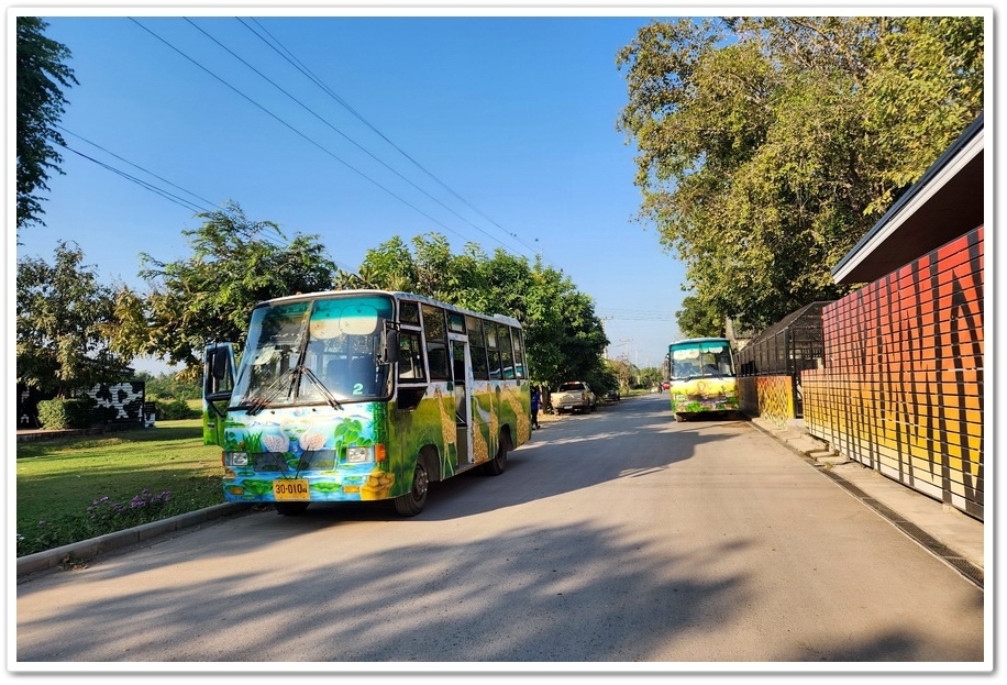 ▲ 上圖是『北碧府野生動物園』的中型巴士遊園車,只要購買動物園門票500元泰銖(THB),就能搭乘遊園巴士進入園區在車箱內與動物拍照,但是在搭上遊園巴士之前記得要先在入口以50元泰銖購買紅蘿蔔,這樣才可以餵食牠們喔!