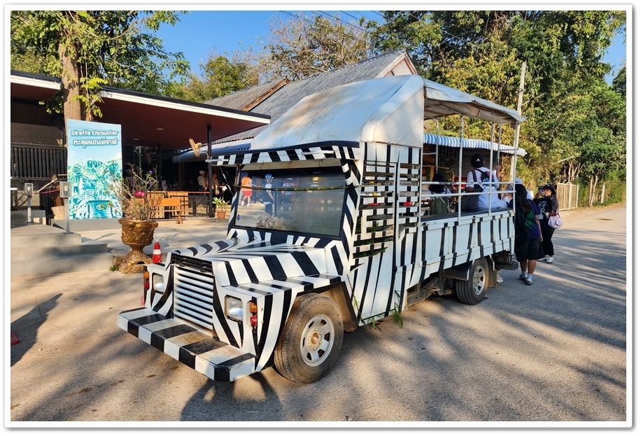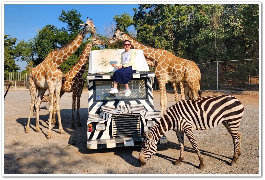 ▲ 接著我們《泰國曼谷+北碧5日遊》的第四天,早上8點從『MIDA RESORT KANCHANABURI 美達渡假村』出發,來到『北碧府野生動物園』,準備要來跟『長頸鹿與吉普車』合照,這是個『網紅VIP行程』要提早預約跟自費的,因為這是目前人氣最高的網紅行程,預約搭乘『斑馬紋吉普車』與『長頸鹿』近距離接觸合影!