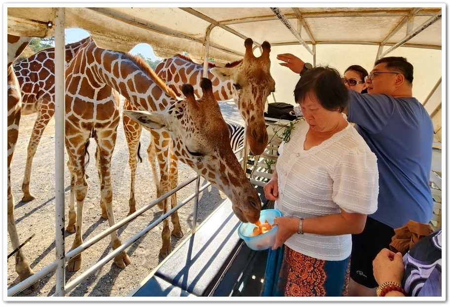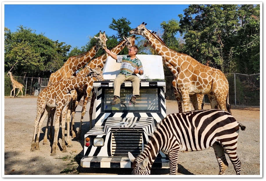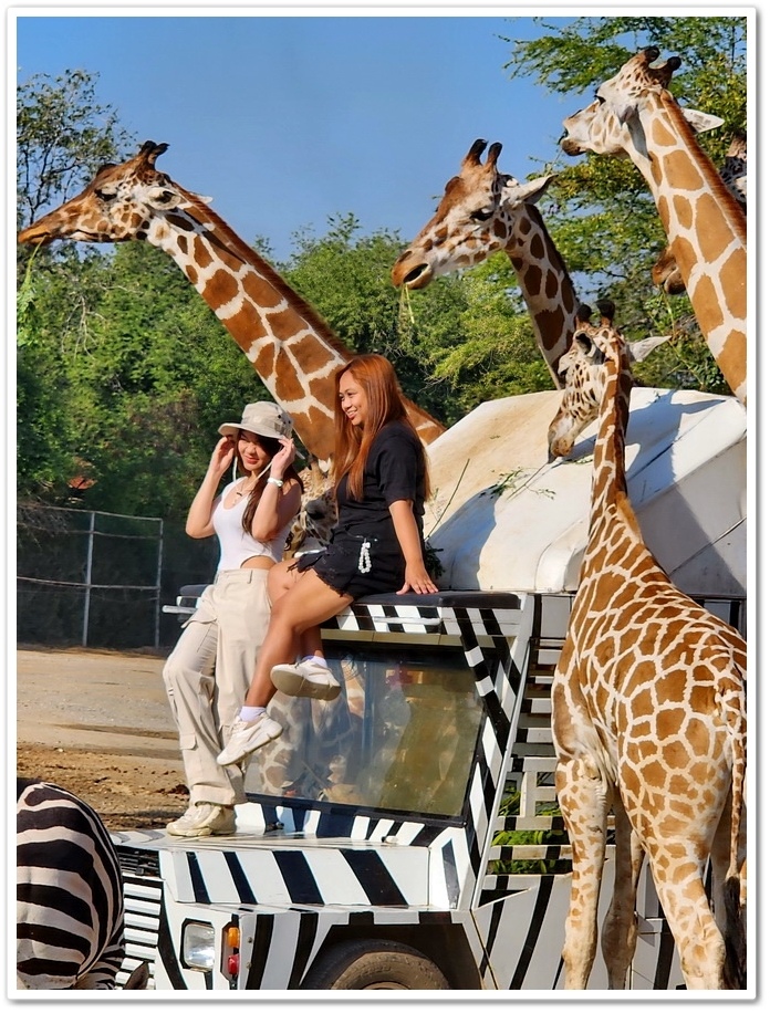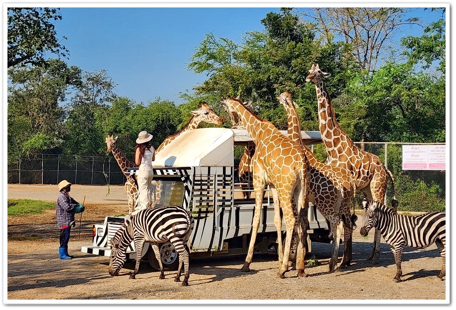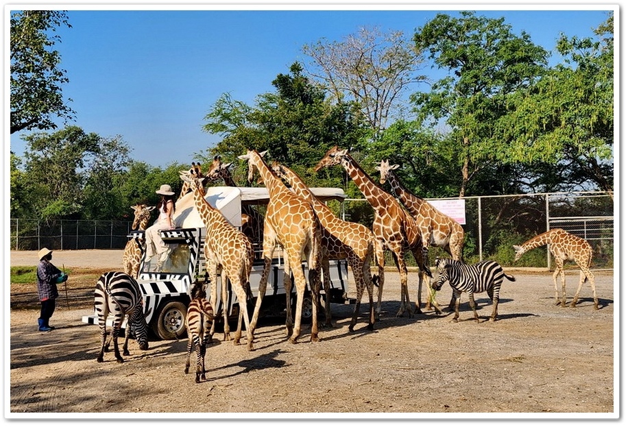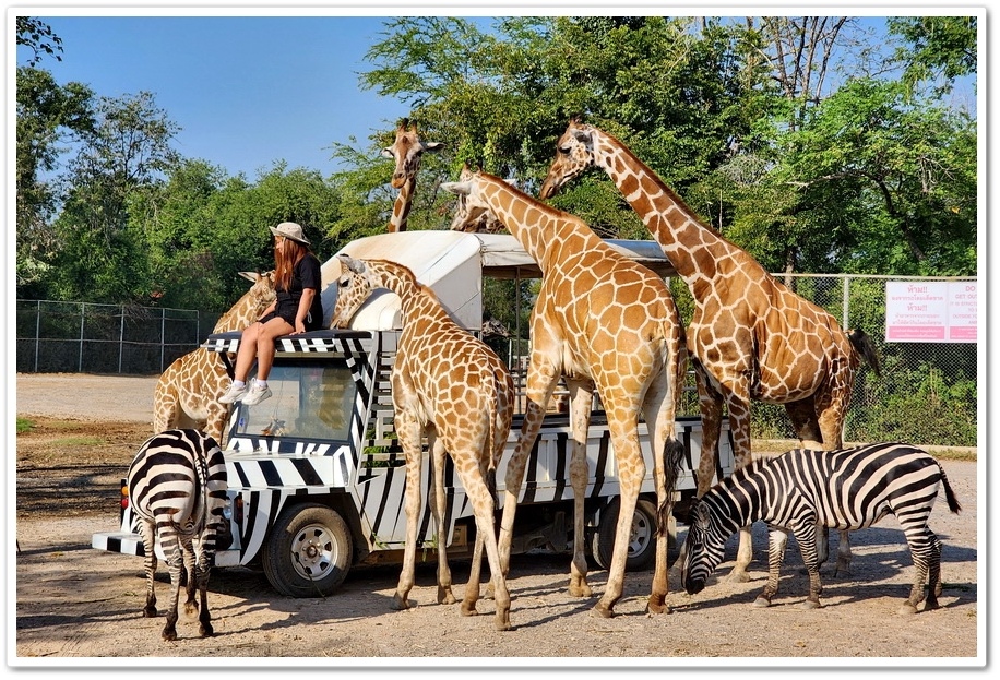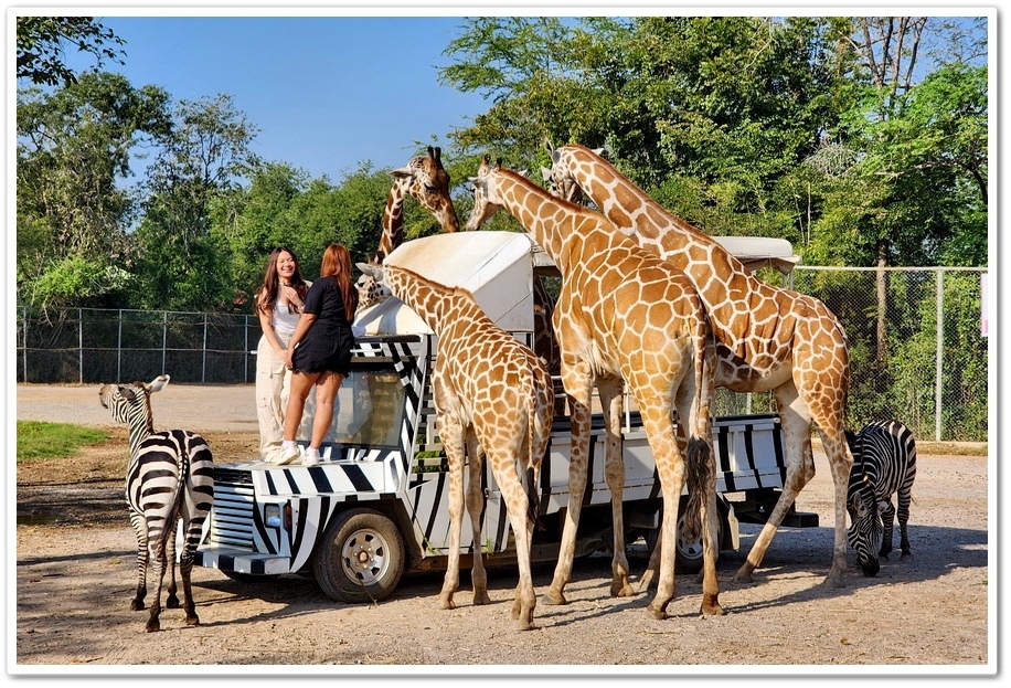 泰國『北碧府』天然資源豐富,野生動物多樣,加上泰國政府大力發展旅遊,以及民眾保育意識提升,促成眾多野生動物園的興起。近來有四家野生動物園陸續推出搭乘『遊園車上餵食長頸鹿』的體驗,以及『斑馬紋吉普車』與『長頸鹿』近距離接觸合影,讓遊客與長頸鹿近距離互動,使得車上的驚笑聲連連!
