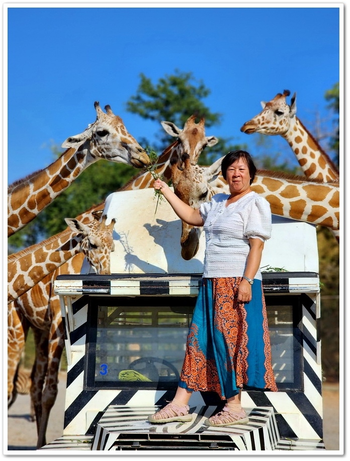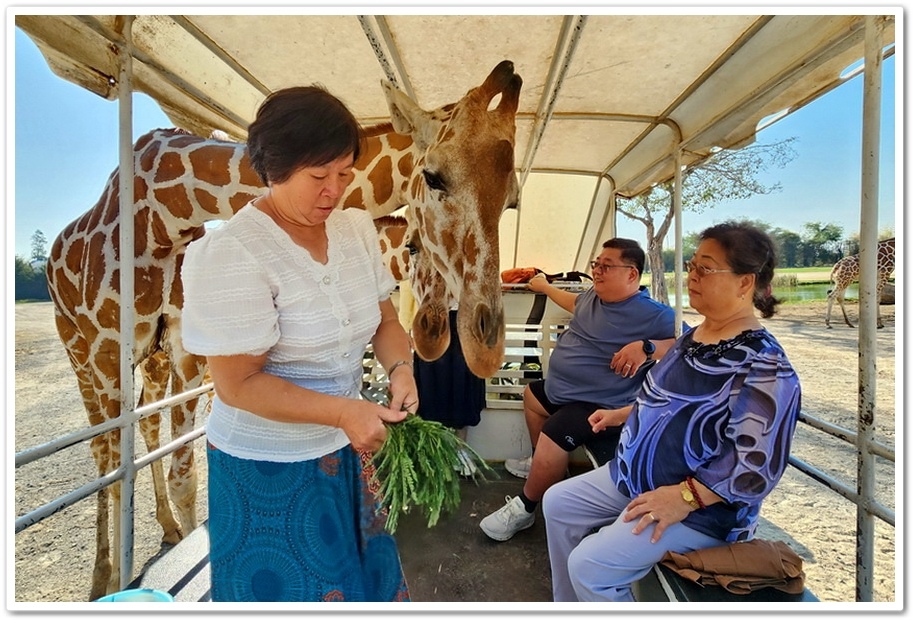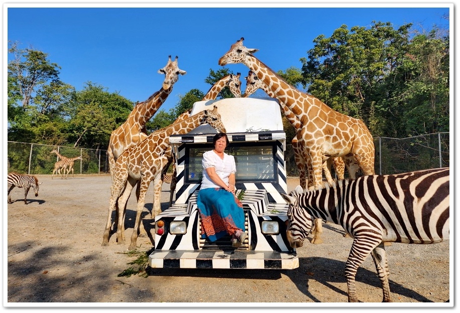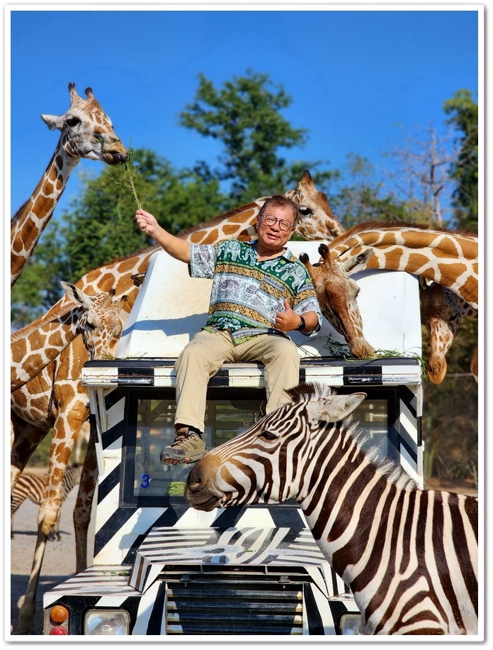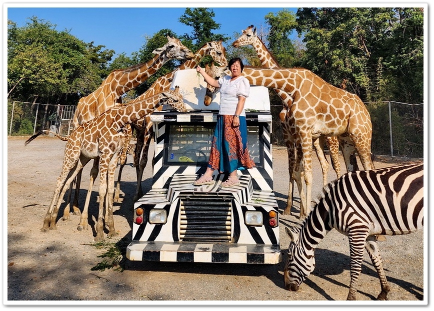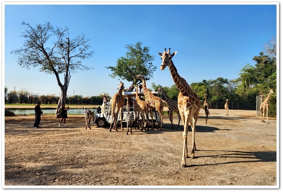 泰國『北碧府』天然資源豐富,野生動物多樣,加上泰國政府大力發展旅遊,以及民眾保育意識提升,促成眾多野生動物園的興起。近來有四家野生動物園陸續推出搭乘『遊園車上餵食長頸鹿』的體驗,以及『斑馬紋吉普車』與『長頸鹿』近距離接觸合影,讓遊客與長頸鹿近距離互動,使得車上的驚笑聲連連!