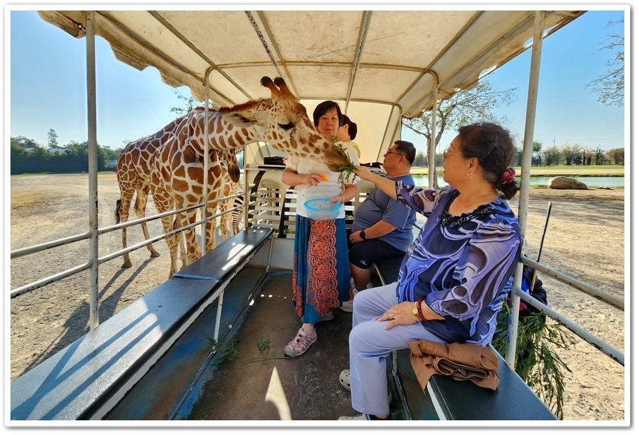 當你乘搭遊園巴士探訪長頸鹿時,牠們會把頭伸進車內,當你看到體形如此龐大的長頸鹿時,相信你一定會感到驚訝,但也絕對是你難以忘懷的回憶喔!而100元泰銖可以購買到兩桶紅蘿蔔,若是2至4人一同前往,其實兩桶紅蘿蔔亦能足夠讓你餵食動物!