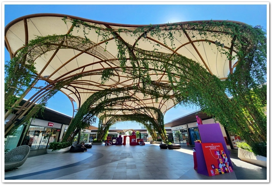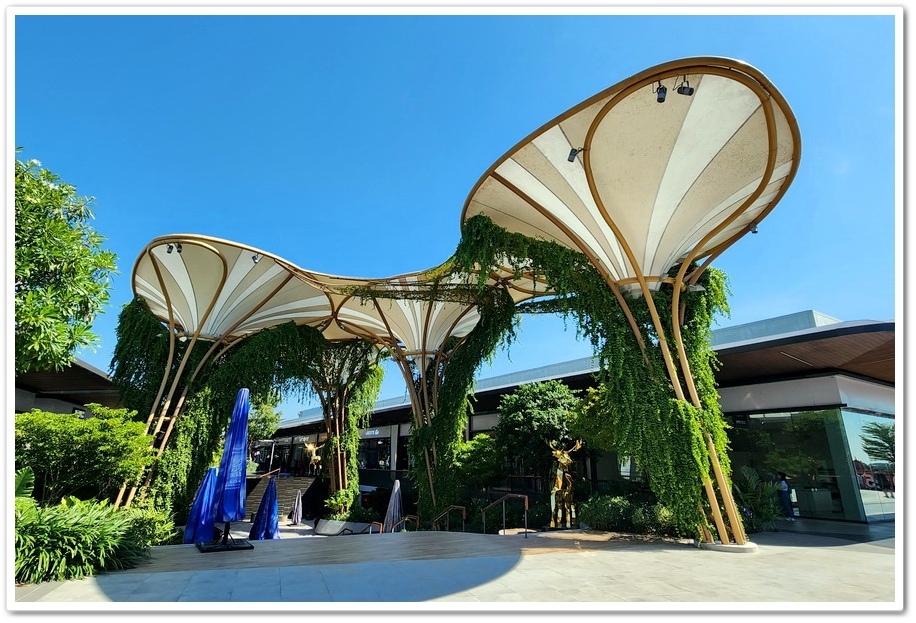 『Siam Premium Outlets Bangkok 商場』挑高的公共空間,搭配流線型的景觀,讓人的視野感到相當舒服!綠植爬滿建築也好令人心動,有種森林系的清新感!建築設計色調自然,重視環保以及綠化,這裡也有許多泰國藝術家的大型造景裝置,非常適合來散散步拍拍美照哦!