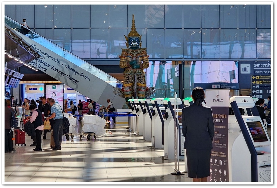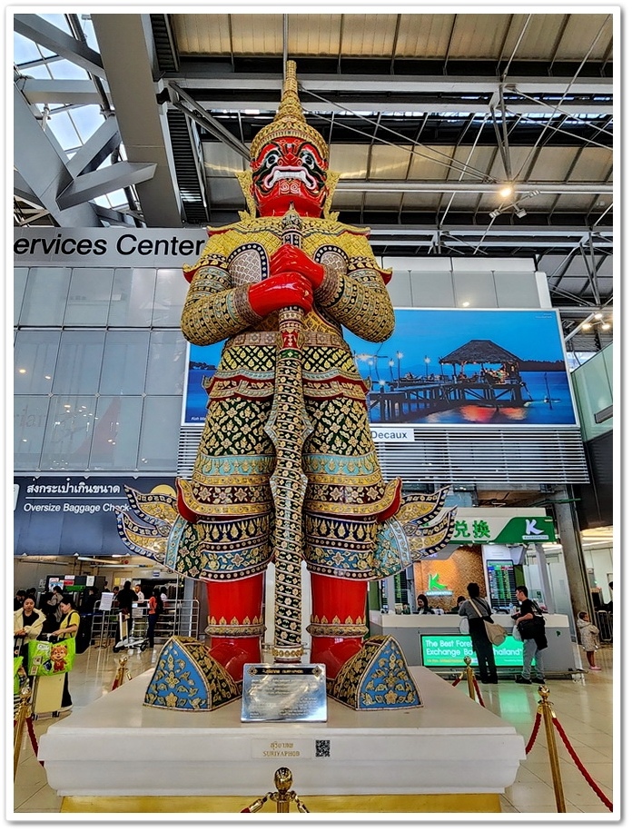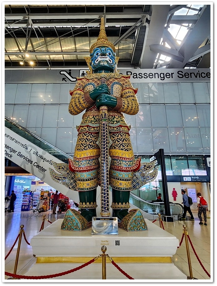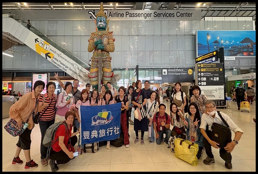 ▲ 辦完行李托運後,我們在機場大廳門神『夜叉王』見證下,拍張『泰精采之旅』的畢業照!看似面目猙獰的佛像稱為『門神』、『守護者』或『夜叉王』。這些巨人是『拉瑪堅』神話故事裡的人物,『拉瑪堅』是由印度史詩《羅摩衍那》派生出來的泰國史詩。『夜叉王』一共有12尊,紅臉、綠臉、紫臉、白臉以及藍臉等等,但我只拍到兩尊,同時我在『鄭王廟』參觀時也有拍到兩尊『夜叉王』