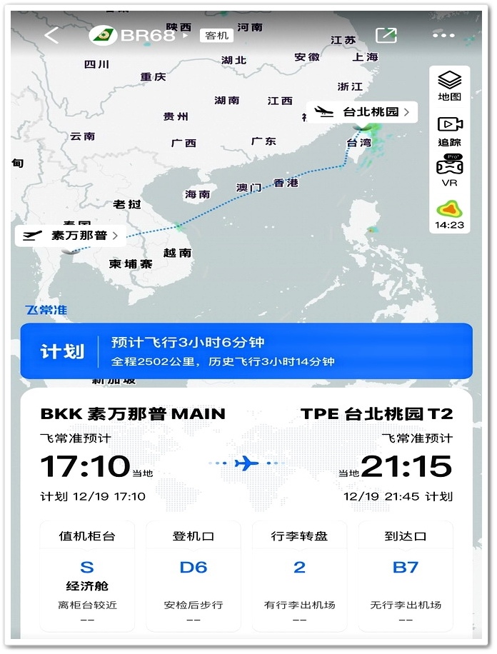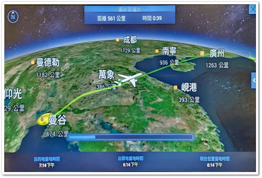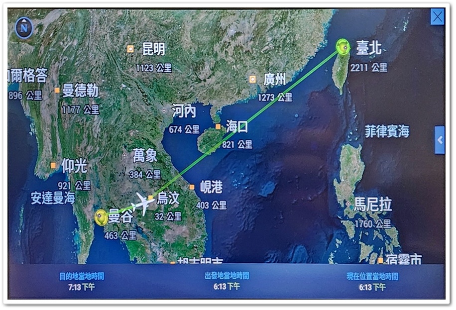 ▲ 觀看飛航資訊的好處就是能知道飛機的動向與位置,並且學學地理知識,像是現在飛機已飛到泰國『萬象』上空,距離曼谷有468公里,到達『桃園國際機場』還有2185公里,所以由『桃園國際機場』到曼谷『蘇凡納布機場』共有2653公里