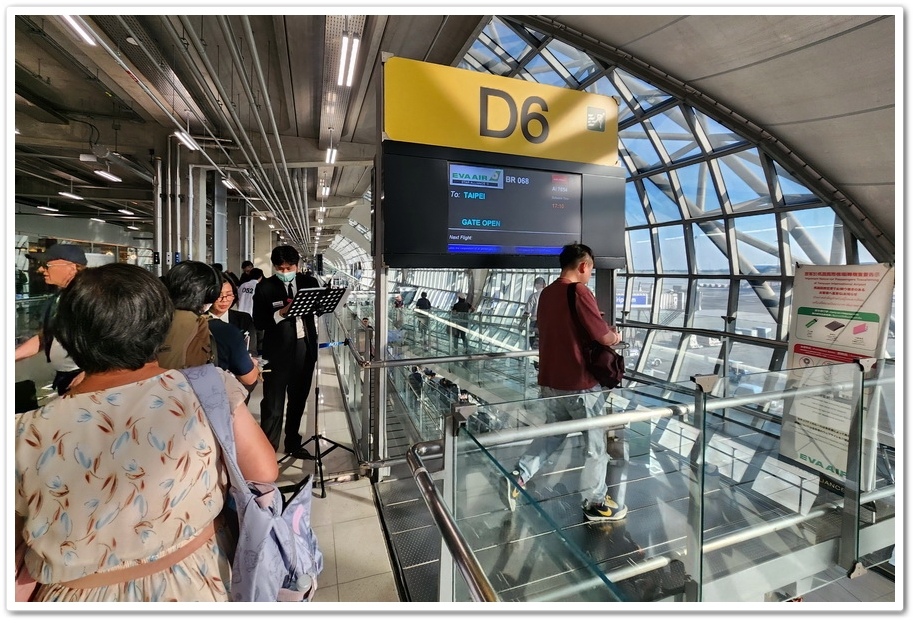 ▲ 然後下午2點半開始進入曼谷『蘇凡納布國際機場』辦理報到手續,而我們回台灣的班機是『長榮航空』BR068航班,下午16:40分D6登機口登機,17:10分起飛,抵達台灣『桃園國際機場』是21:15分,接著旅行社安排的9人座小巴會來接機,凌晨2點就會回到溫暖的家囉!