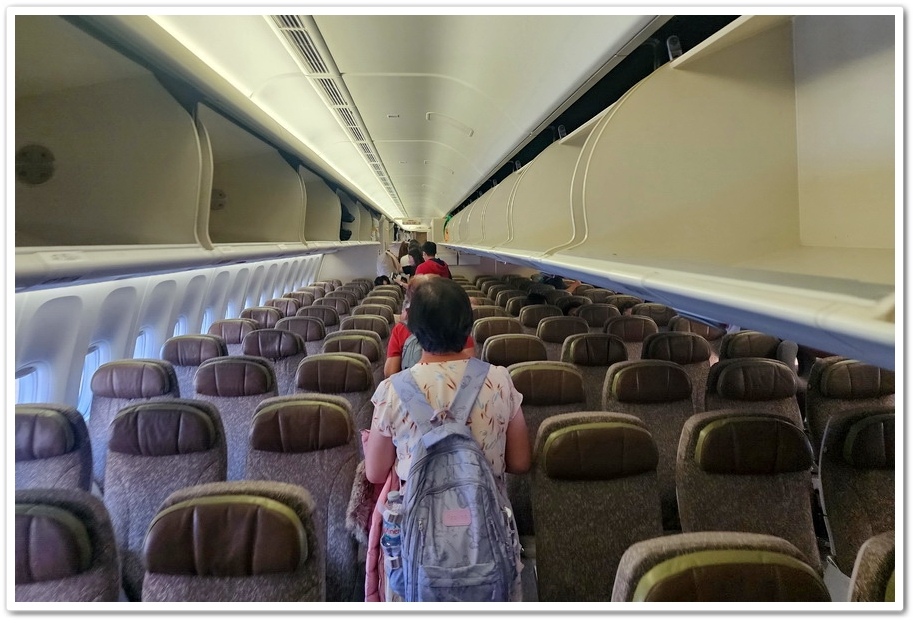 ▲ 我們坐位是70F,也就是坐在機尾最後面倒數第三排,所以機尾的乘客最先登機,然後是機翅的乘客,再來就是機頭的乘客,商務艙的乘客是最後登機,下機的時後則是反向操作,所以你沒辦法看到坐商務艙的名人有誰?