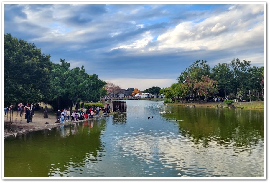 走過橋面踏上湖畔木棧道,欣賞眼前的清澈湖景,搭配四周綠意盎然,讓人不自然跟著放鬆,光是這裡就能拍好幾張照片來紀念。湖畔周圍也有優美寫意的賞景木造亭;大樹下三兩成群在此乘涼賞景,可謂是悠閒自在。綠意湖中水光唯美,周邊生態豐富,可以看到魚群們在水中優游,還有鴨子、烏龜現蹤,園區還提供飼料販賣機,民眾可以在橋上餵魚、餵鴨!
