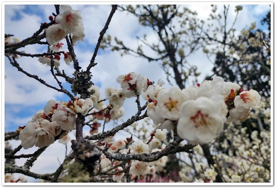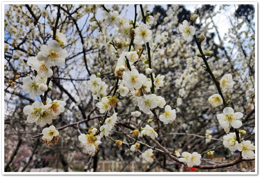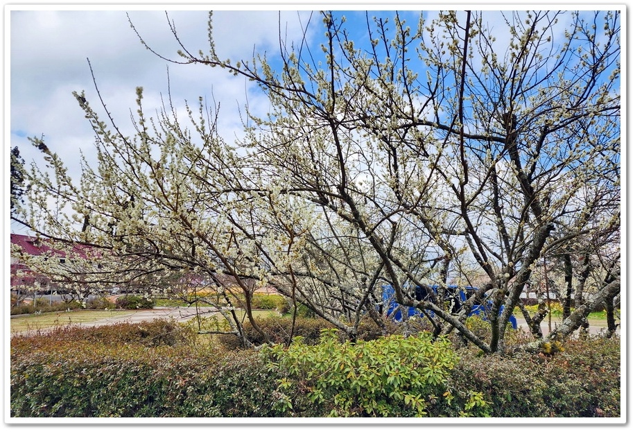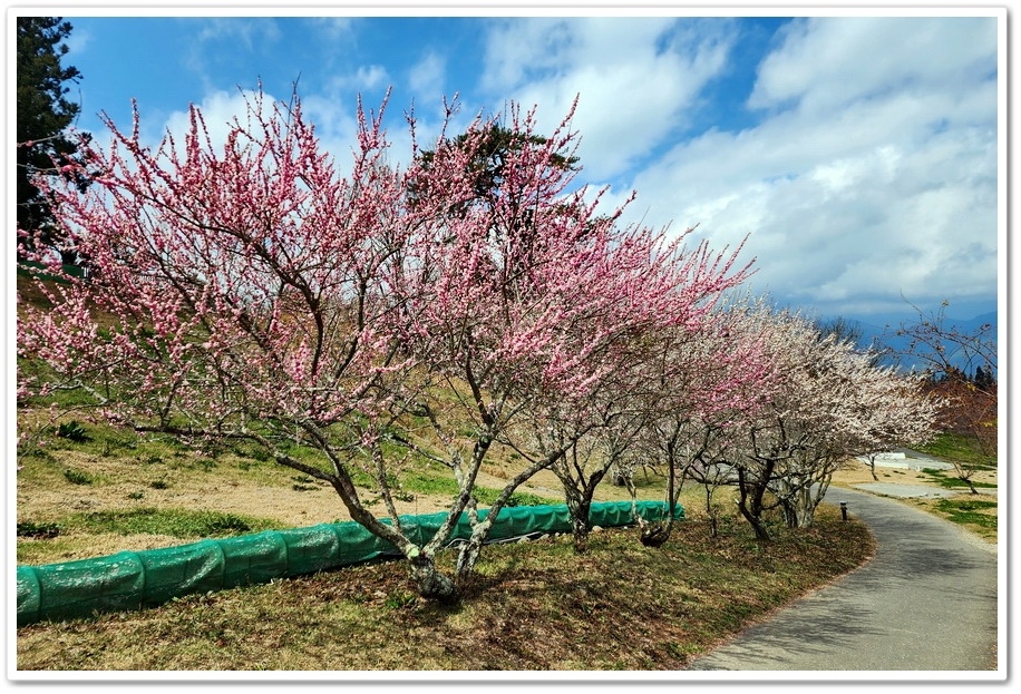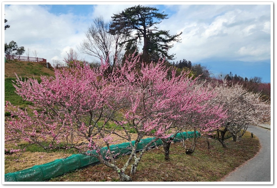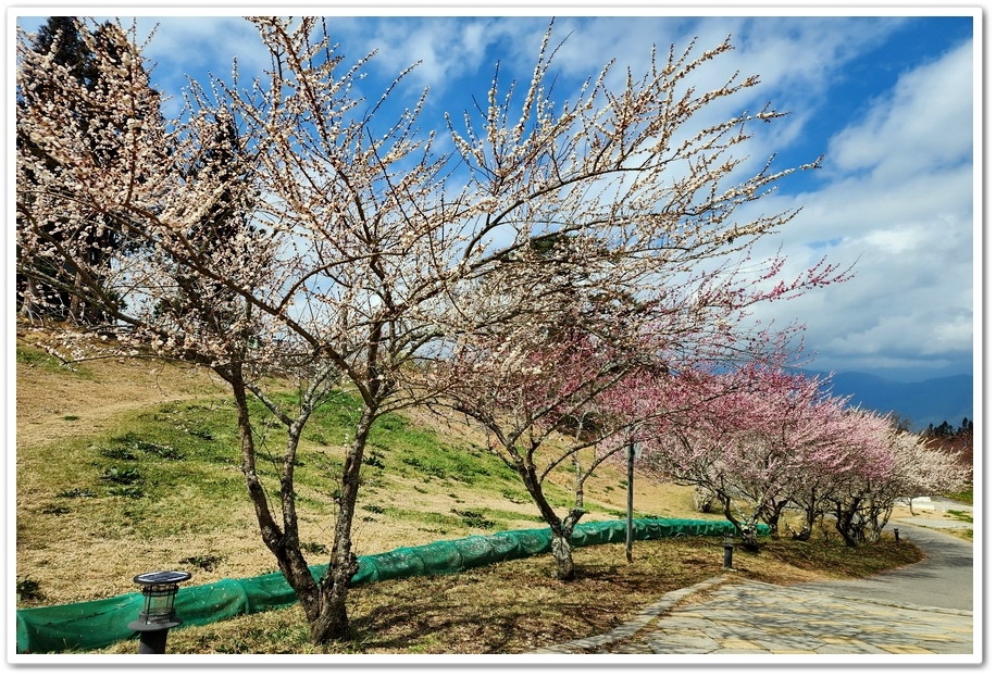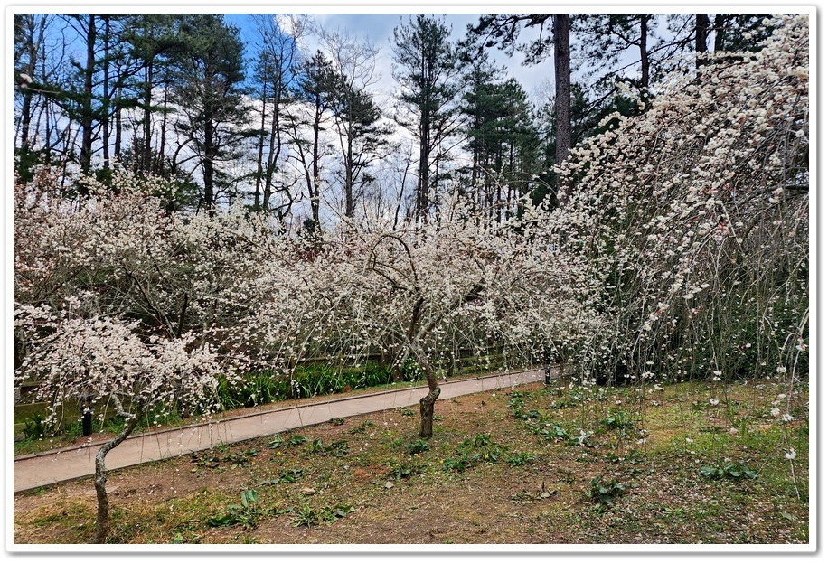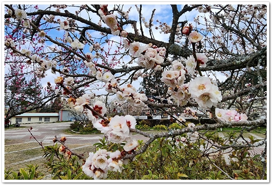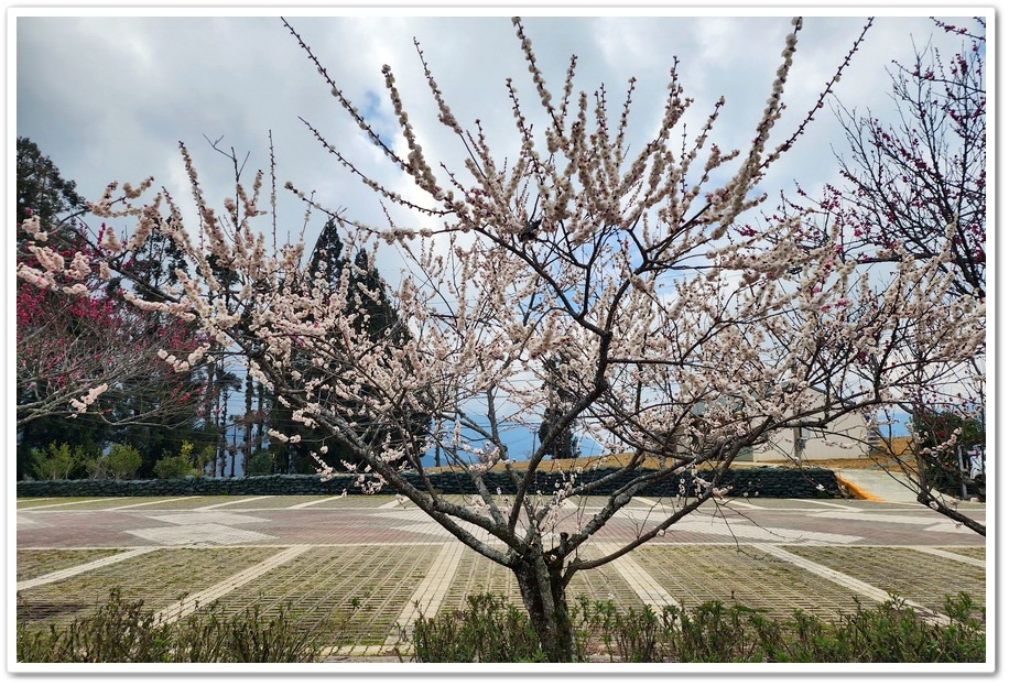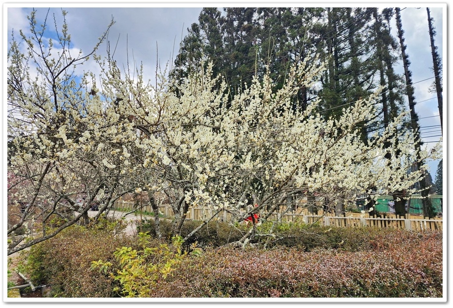 在『福壽山農場』停車場裡種滿許多白色櫻花,白色『大島櫻』上場掀起純白浪漫風暴!『福壽山農場』園區裡的櫻花品種十分多元,種有緋寒櫻、富士櫻、昭和櫻、吉野櫻、大島櫻、御衣黃、鬱金櫻7個品種,櫻花花期一路從2月開到4月初,各品種櫻花分布在千櫻園、鴛鴦湖、百櫻園、茶園以及場本部區
