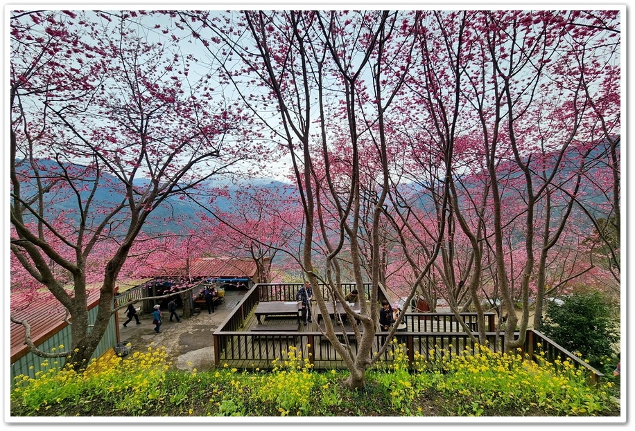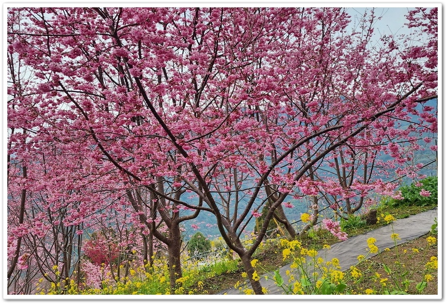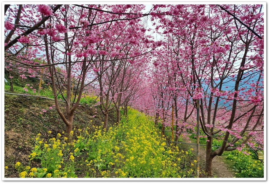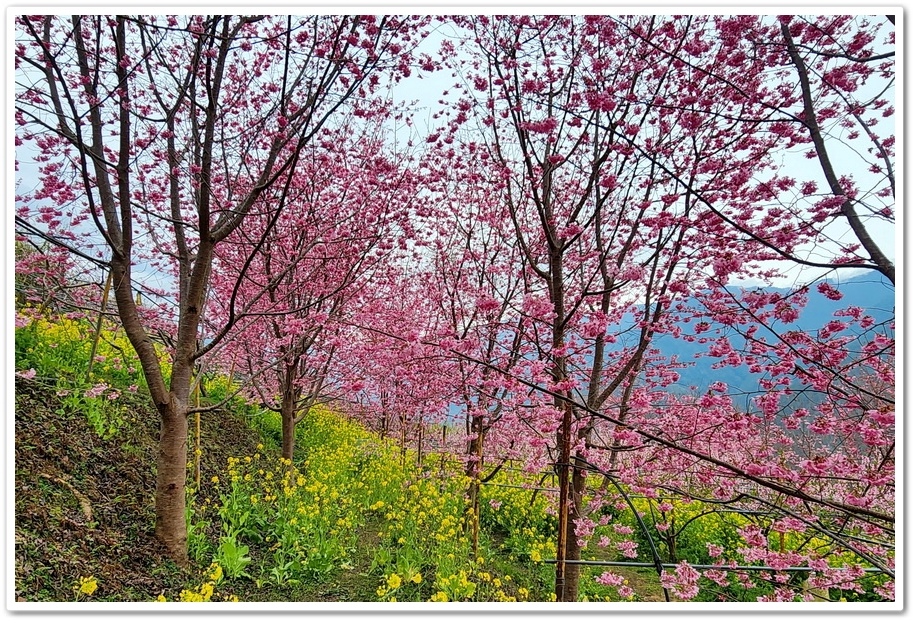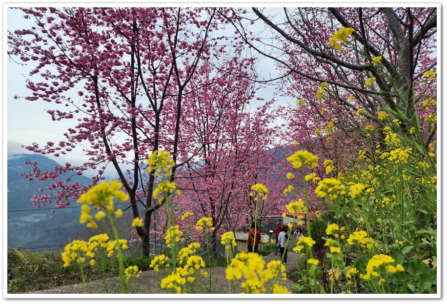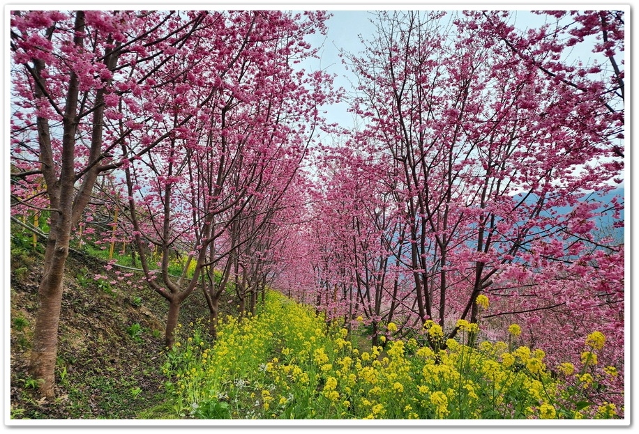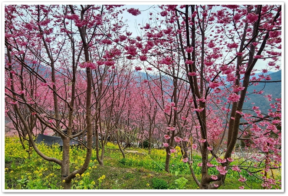 今年涼亭後方的山坡上更種滿了黃色油菜花,黃花加上粉紅櫻花,兩種顏色彼此交織在一起更顯美麗。『財伯觀光果園』堪稱是尖石部落賞櫻秘境,來這裡完全不用人擠人,被粉紅花海包圍的果園,好美好夢幻!