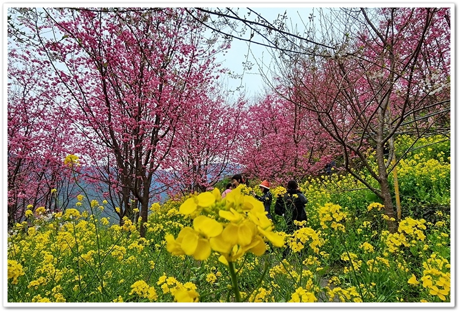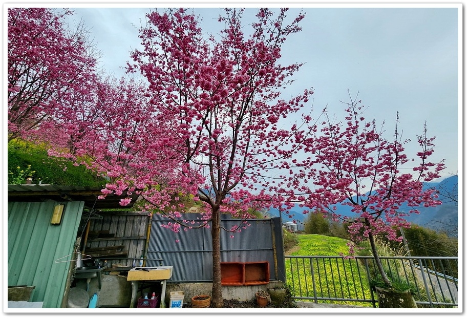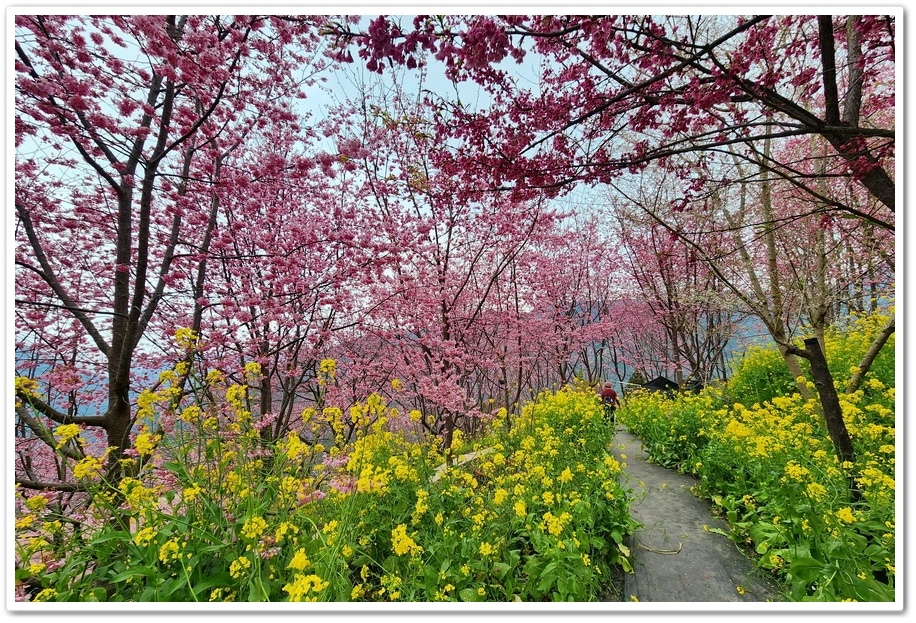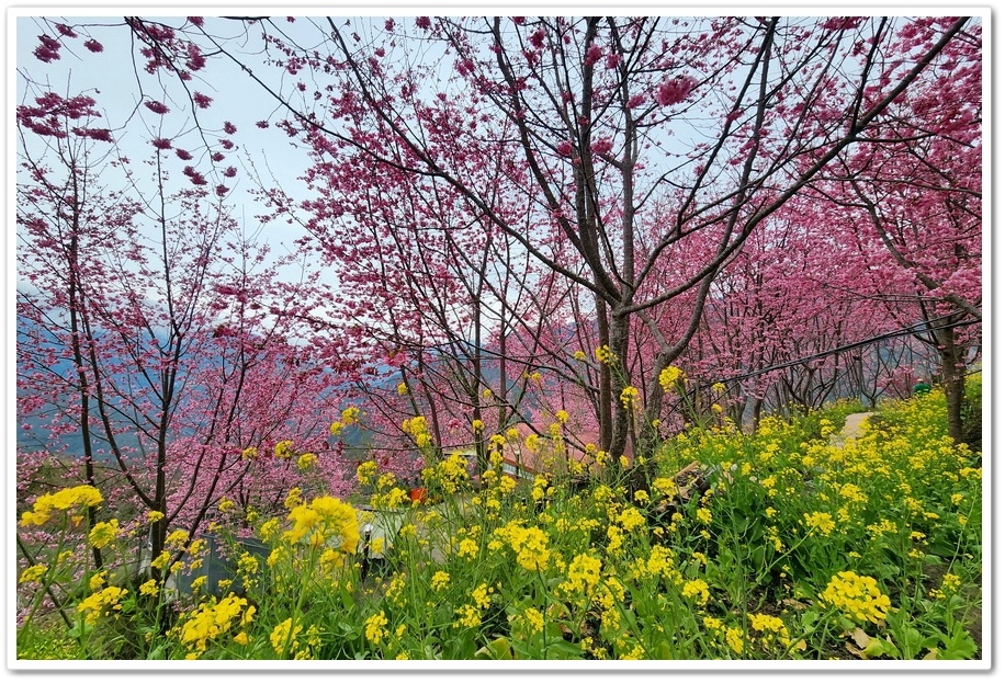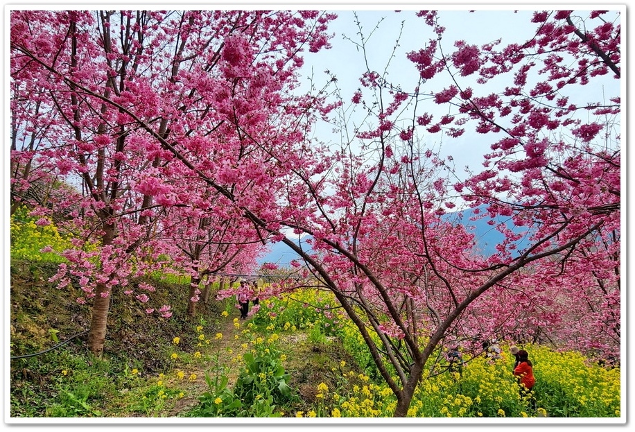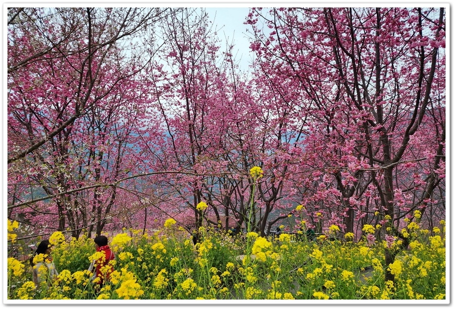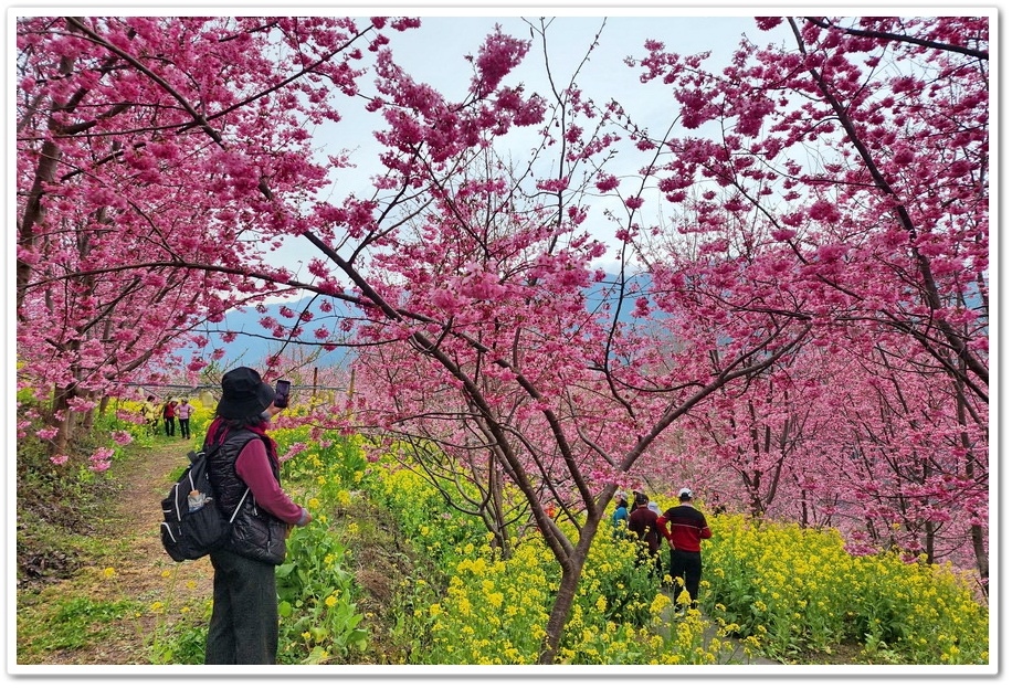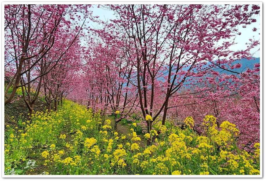 今年涼亭後方的山坡上更種滿了黃色油菜花,黃花加上粉紅櫻花,兩種顏色彼此交織在一起更顯美麗。『財伯觀光果園』堪稱是尖石部落賞櫻秘境,來這裡完全不用人擠人,被粉紅花海包圍的果園,好美好夢幻!