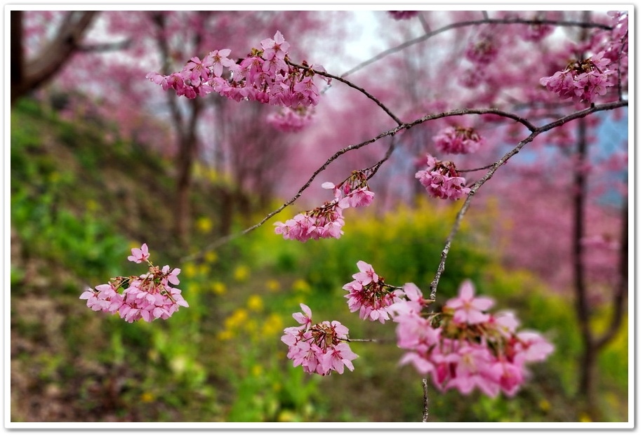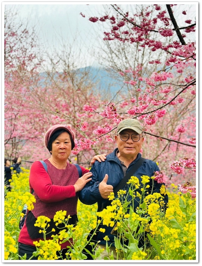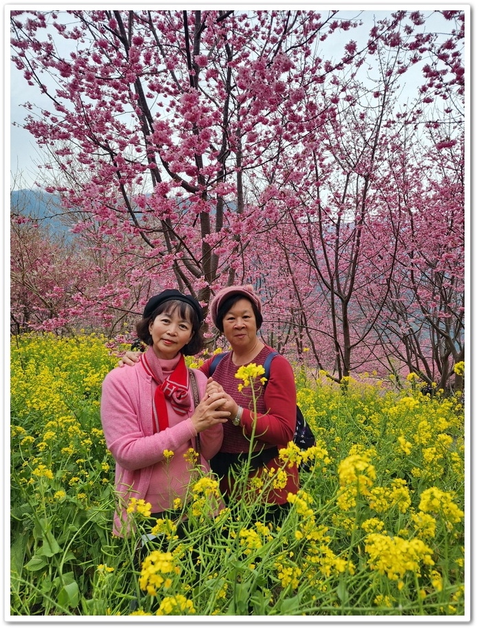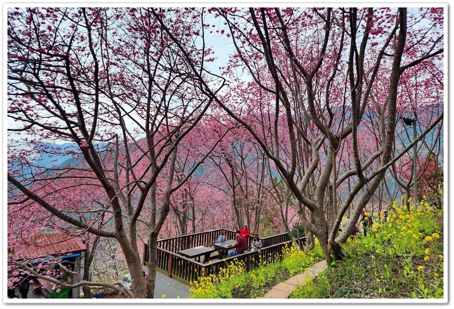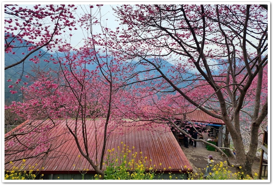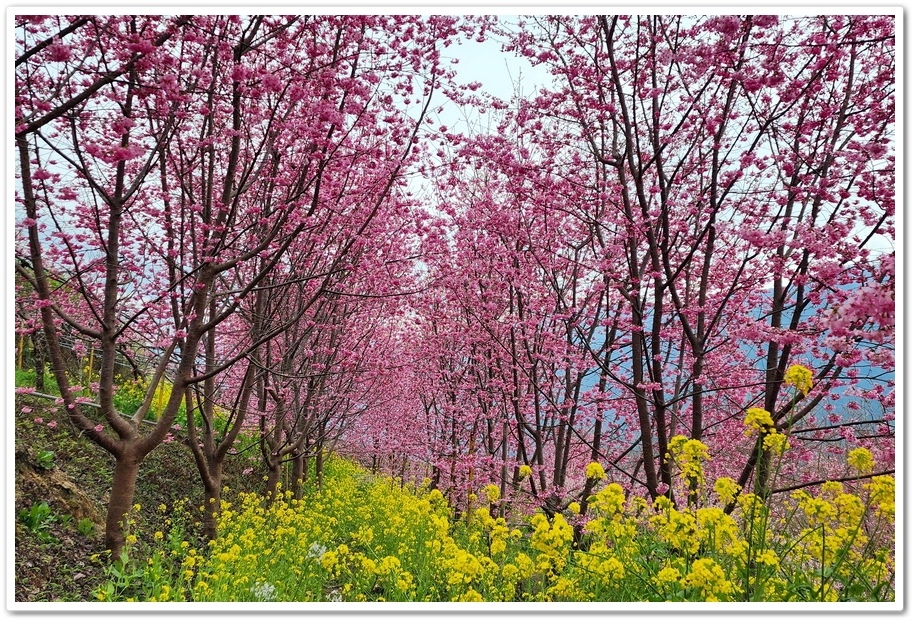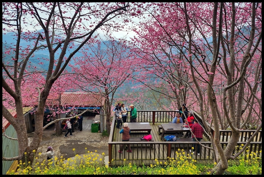 今年涼亭後方的山坡上更種滿了黃色油菜花,黃花加上粉紅櫻花,兩種顏色彼此交織在一起更顯美麗。『財伯觀光果園』堪稱是尖石部落賞櫻秘境,來這裡完全不用人擠人,被粉紅花海包圍的果園,好美好夢幻!