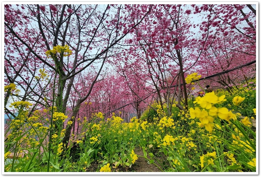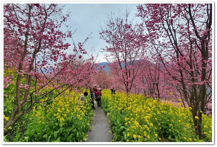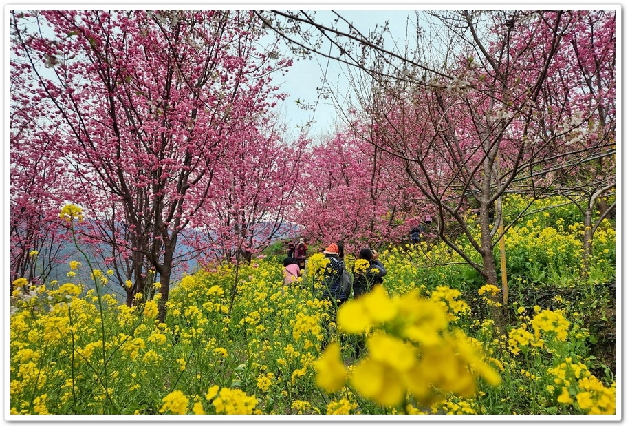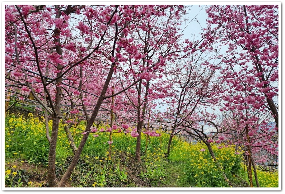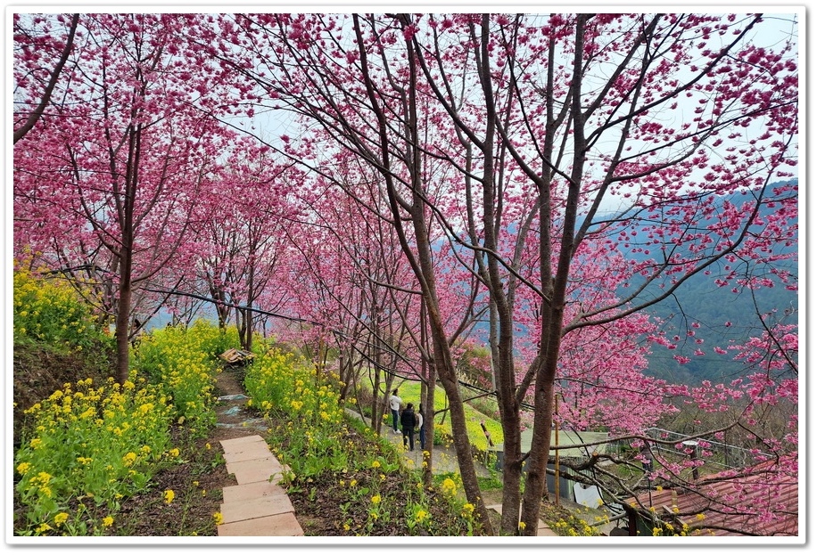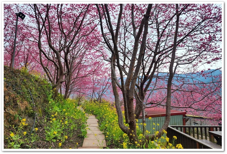你也可以再往上面走,再上一層的山坡邊有顏色鮮豔的油菜花,向下望去可以看到被櫻花樹圍繞的涼亭,實在非常夢幻!2025年2月26日的『財伯觀光果園』正是最佳賞櫻時間,園區櫻花都已達到滿開,大家可以擇日前往賞花囉!