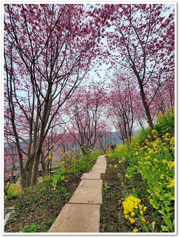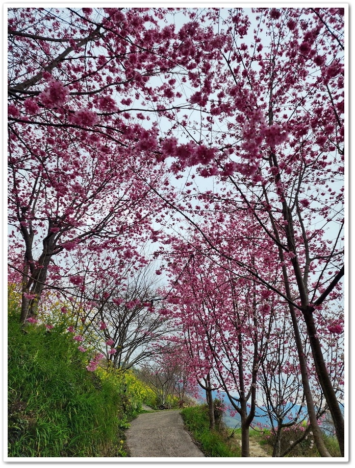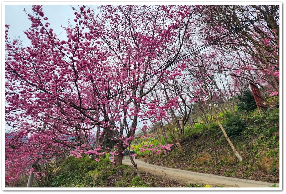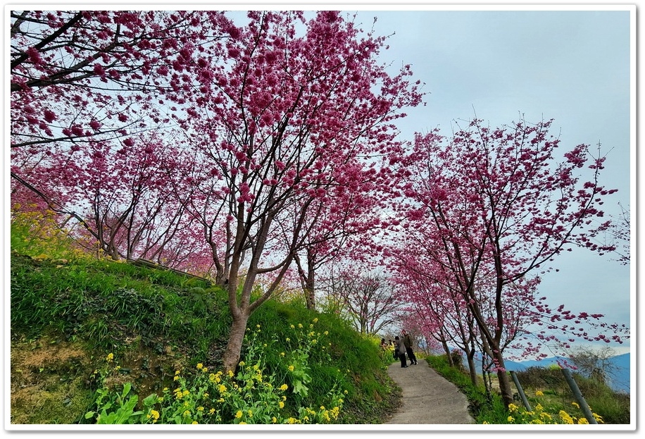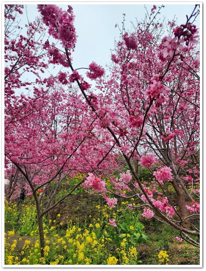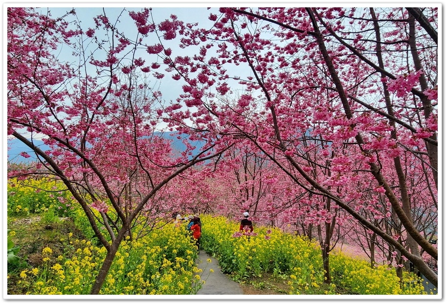 你也可以再往上面走,再上一層的山坡邊有顏色鮮豔的油菜花,向下望去可以看到被櫻花樹圍繞的涼亭,實在非常夢幻!2025年2月26日的『財伯觀光果園』正是最佳賞櫻時間,園區櫻花都已達到滿開,大家可以擇日前往賞花囉!