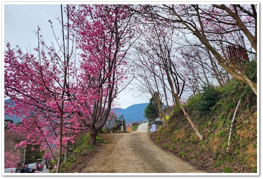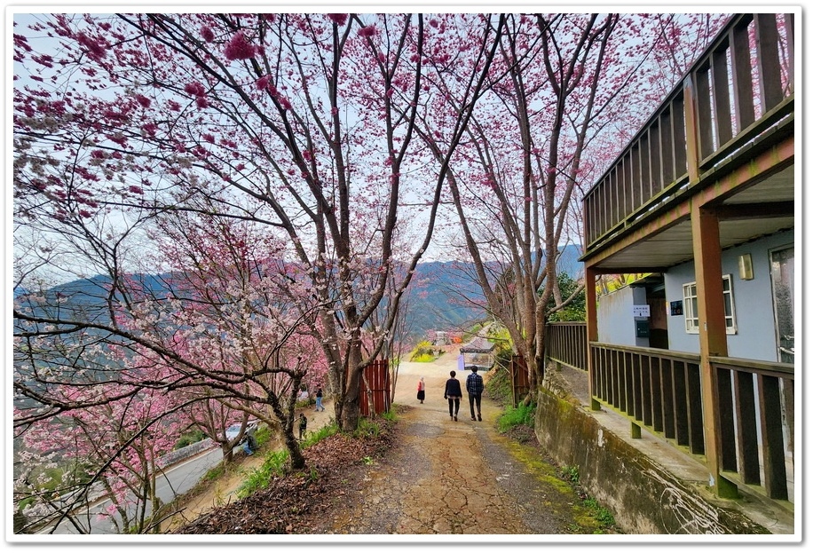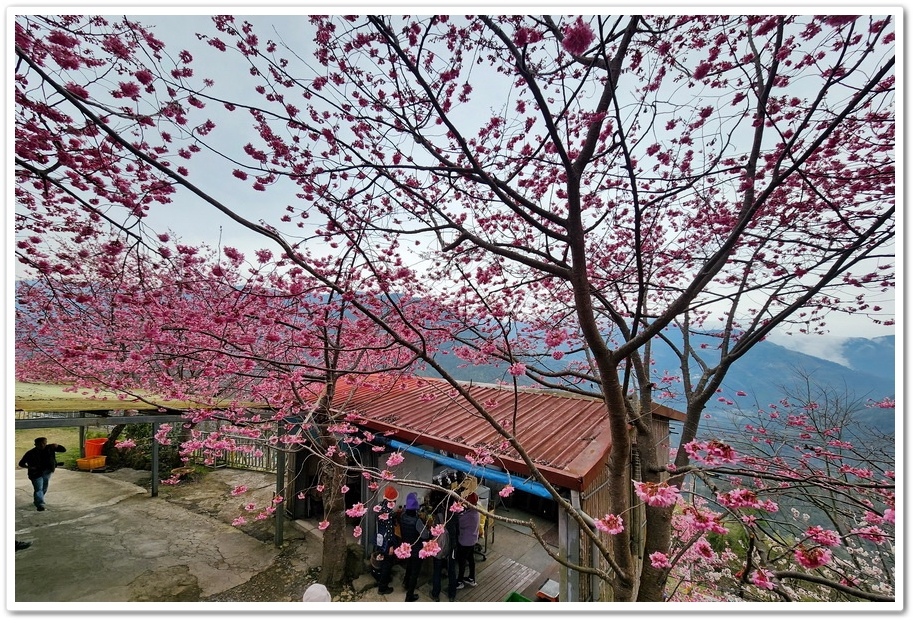 『財伯觀光果園』算得上是尖石鄉的賞櫻私房秘境,從入口處的兩旁就可以看到粉嫩嫩的櫻花,而且主人還很大方的免費開放參觀,果園裡的視野非常好,遠眺能看到層層疊疊的山巒美景,相較於『山上人家』、『武陵農場』、『福壽山農場』這些知名的賞櫻去處,這裡的人潮相較少了許多!