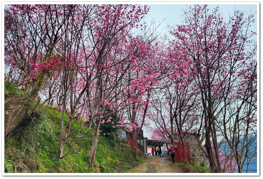 在『財伯觀光果園』賞櫻不僅能近距離與櫻花合影,還能在觀景台能夠近距離與滿天櫻花拍照,也可以俯瞰整片粉色花海,彷彿被浪漫的櫻花包圍。果園內被櫻花滿滿的包圍,坡地美得讓人不禁想停下腳步,深深沉浸在這片粉色世界中