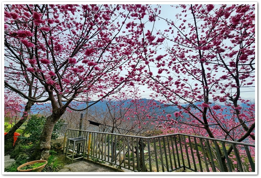 『財伯觀光果園』櫻花正好是滿開花況,園區內放眼望去是一整片的粉紅色櫻花海。在觀景涼亭上,感覺被櫻花給包圍的夢幻氛圍。果園雖然不大,但能感受到主人細心的維護,也才能讓我們賞到如此的美景