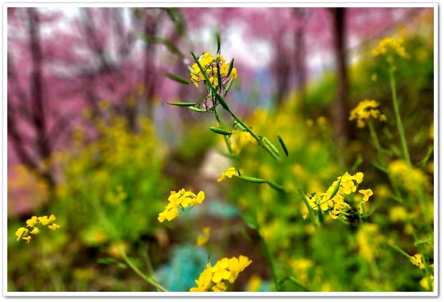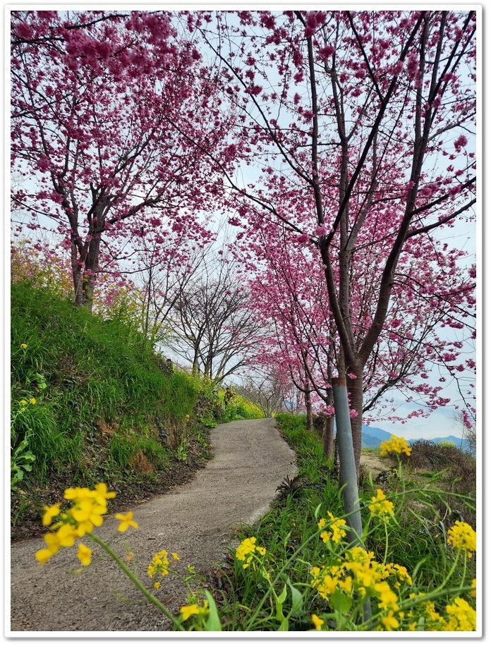 你也可以漫步果園小徑上,這裡也有小小一區的櫻花隧道感受,再搭配上澄黃的油菜花田,實在是美極了!『財伯觀光果園』免費參觀,假日有販售一些農產品,還有熱食。櫻花很美!還有幾株霧社櫻,整片的油菜花,粉紅、白、黃綠湊在一起,真的是美不勝收!