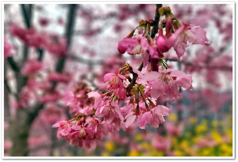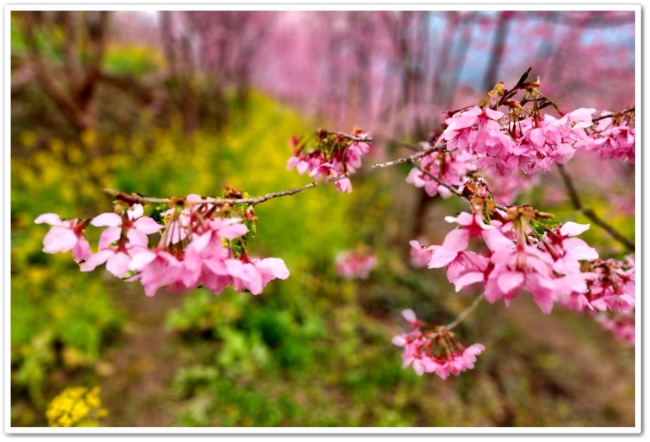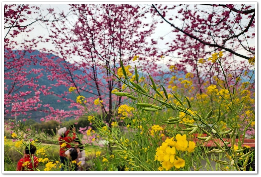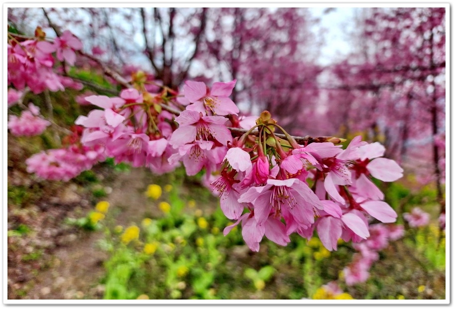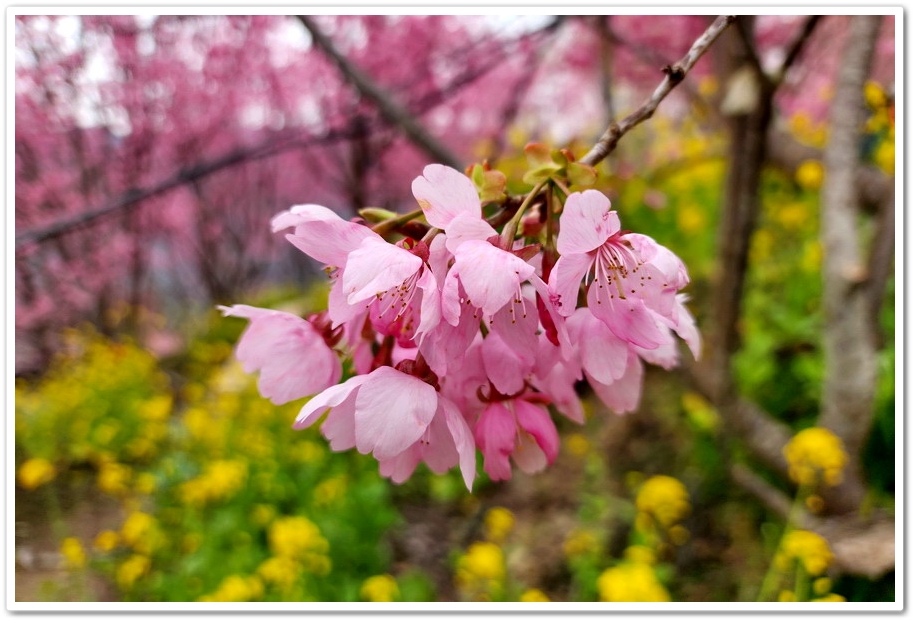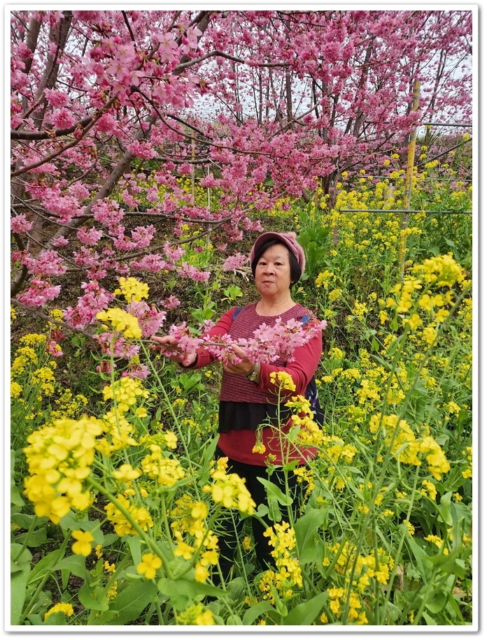 鮮豔的黃花加上粉紅色的櫻花,還有晴朗的藍天白雲相襯之下,豐富的色彩就成了最美的一幅風景。低頭賞黃花,抬頭賞櫻花,各自美麗!『財伯觀光果園』的櫻花果然還是很厲害!難怪會有那麼多的網友分享!