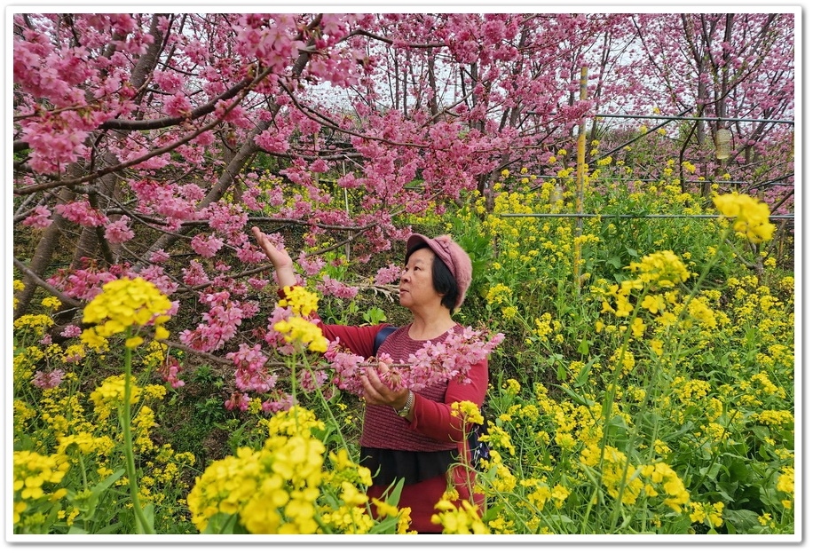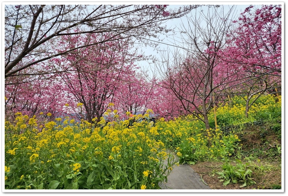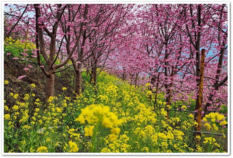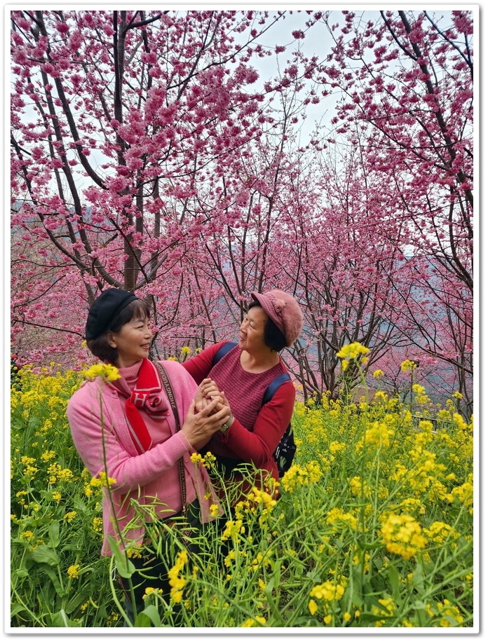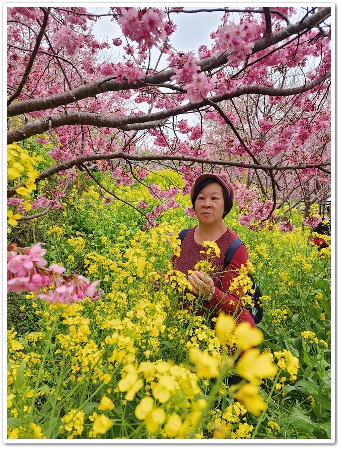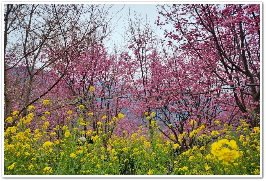 目前滿開中!正是賞櫻好時機,一起來欣賞粉紅櫻花與金黃油菜花交織的美景,感受一下春天的氣息!無論從哪個角度拍攝,黃色油菜花搭配藍天與盛開的櫻花,呈現出令人驚豔的畫面,讓每個瞬間都成為值得珍藏的回憶!