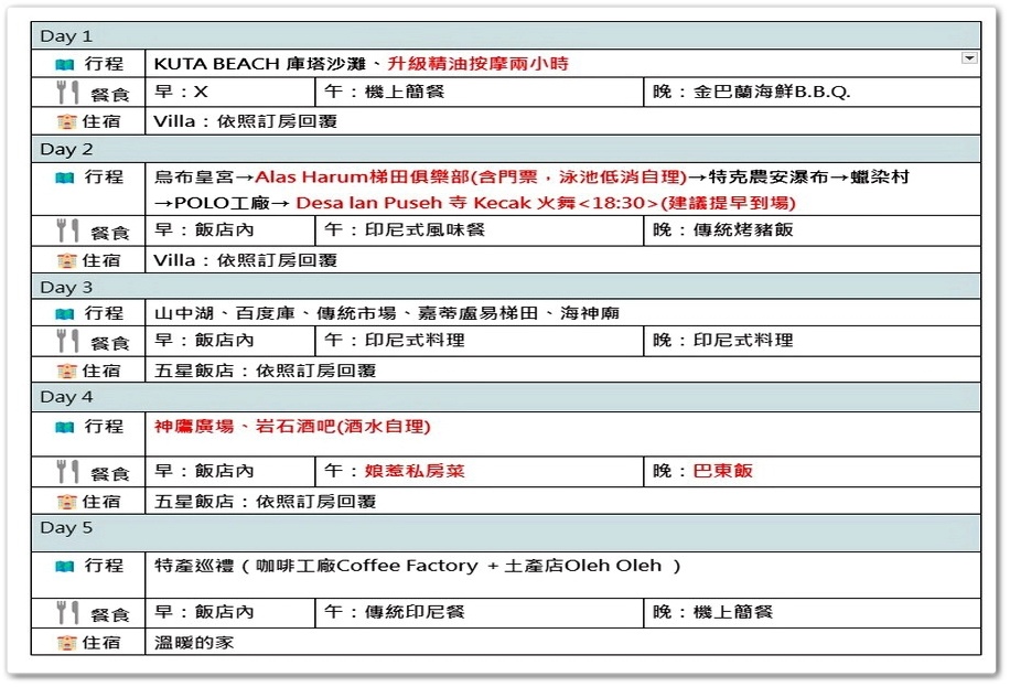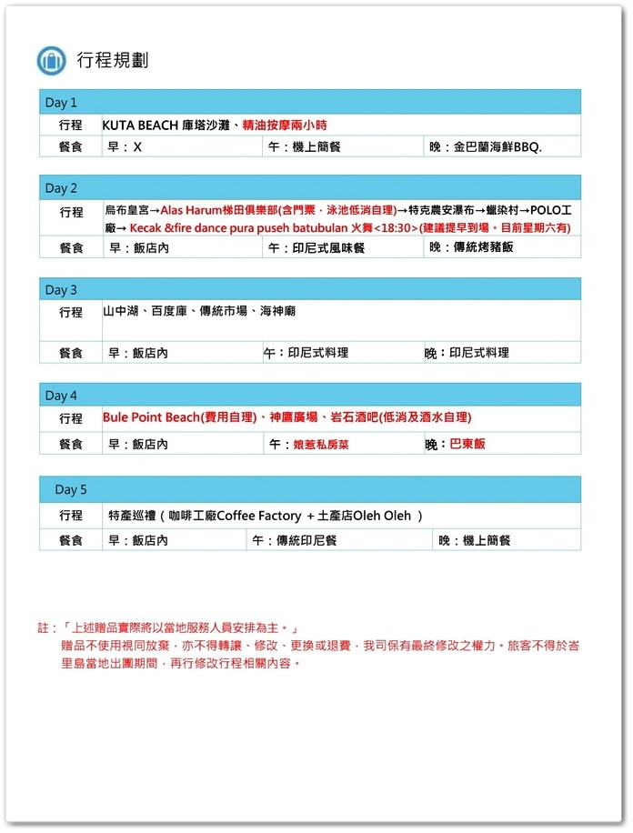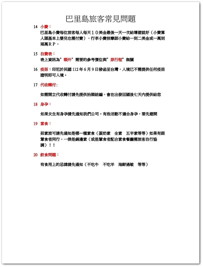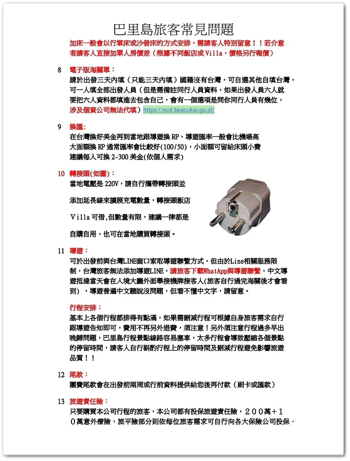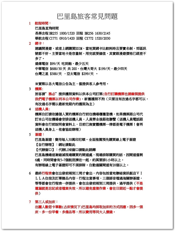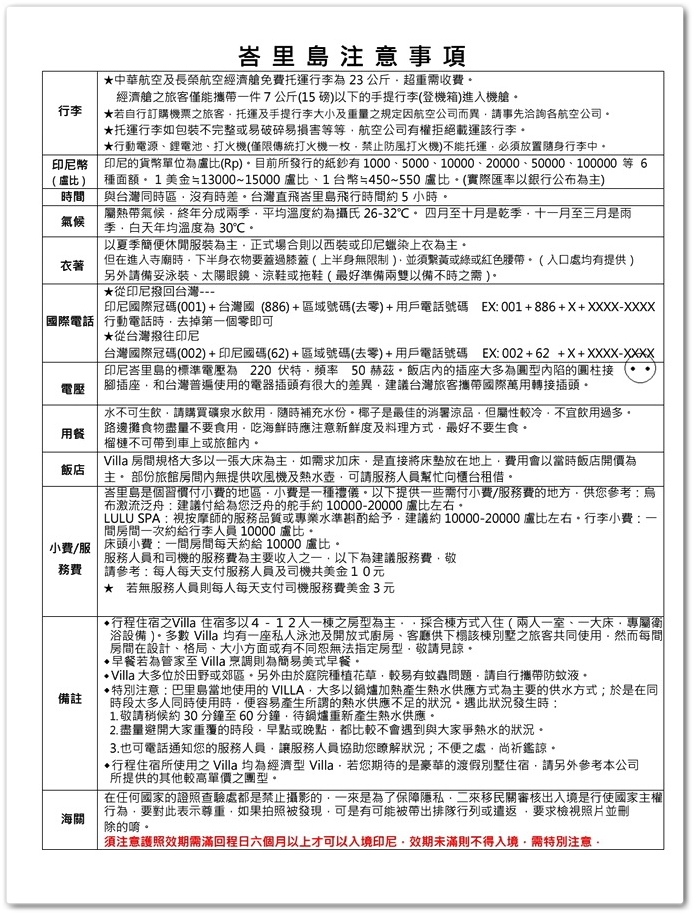在行程大致底定之後,接下來該注意的事項還是要稍為注意一下!每一家航空公司的規定大同小異,但旅行社還是有義務要告知旅客!不過!感覺『喬瑞旅行社』在細節方面都做得很好,包括台灣方面的送機安排,以及『峇里島』方面的中文導遊和9人座小巴車輛,跟接機服務都做得很好,是一家值得信賴的旅行社!