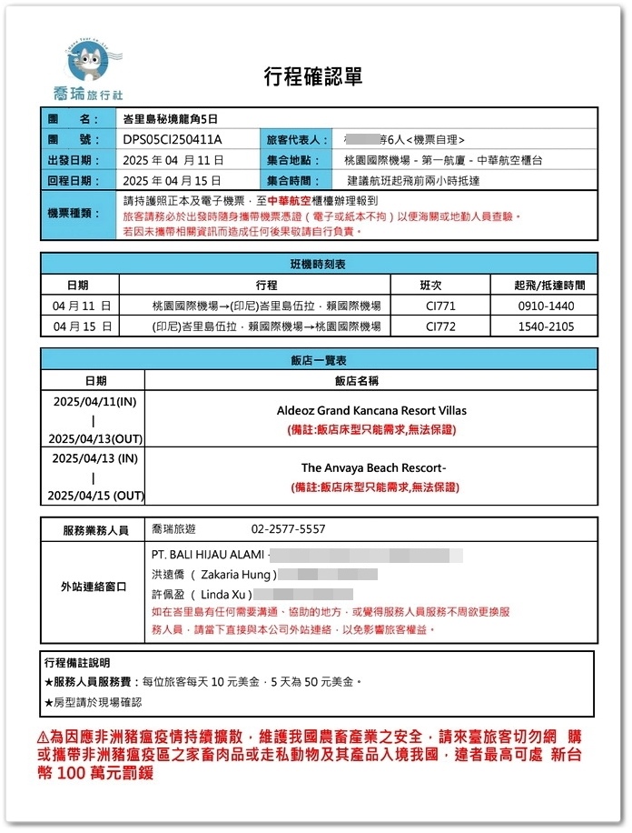 組成6人團決議要去『印尼峇里島』渡假之後,我們就開始找旅行社規劃行程,適逢2024台北國際旅展在『南港展覽館』舉行,因此好友前往旅展找到『喬瑞旅行社』,辦理行程吃住安排及接送機服務,機票則由自己購買,旅行社行程訂金3000元+尾款14000元+自購來回機票13347元+印尼簽證2000元+司領費(330元X5天=1650元)+9人座小巴來回接送1466元/人+安達旅平險868元=36331元/人