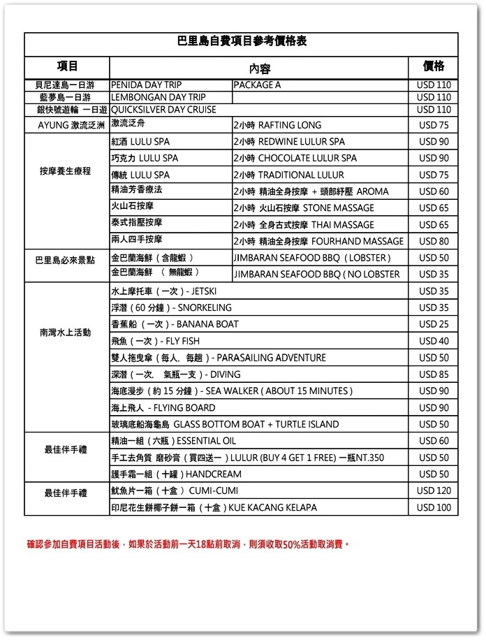 旅行社說沒關係!因為水上活動及海底漫步皆為自費活動,有需要的話!可以隨時請當地導遊安排,並附上『峇里島自費項目價格表』做為參考!還有當地『最佳伴手禮的價目表』。看一看這些自費項目,有些活動還真的不便宜ㄝ!其實!這些水上活動在台灣墾丁、澎湖、綠島也大部份都玩過了!而且台灣還更便宜一點!