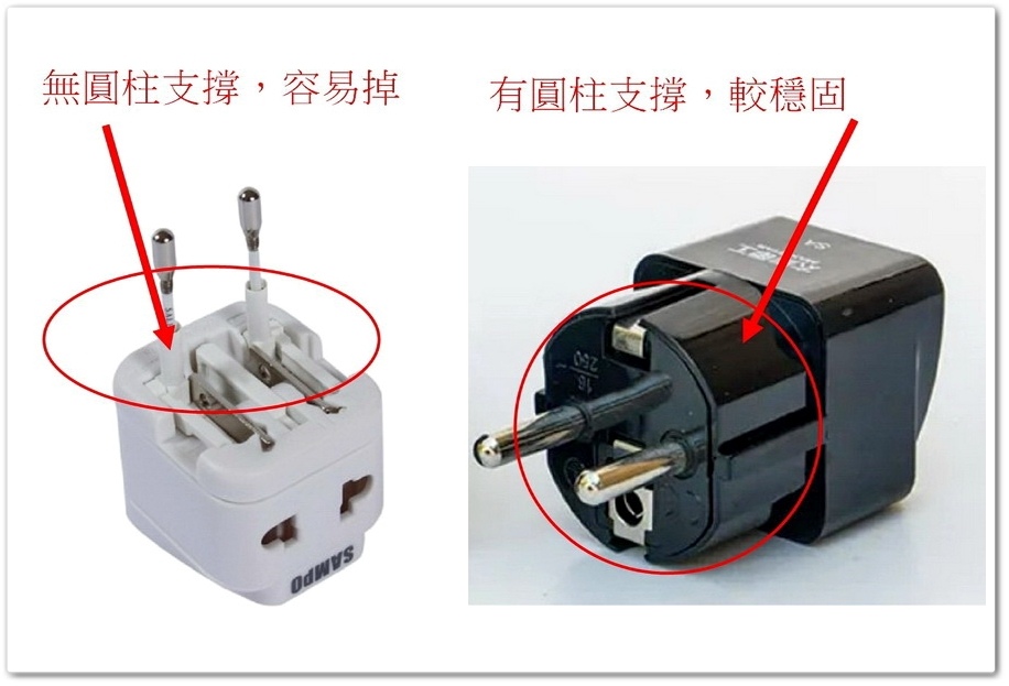 ▲ 上圖是旅行社給的說明,好友則說最好有三支腳的插頭,第三支腳是用來固定,就像我們台灣的三支腳插頭一樣,要使用轉接的時候,不會因重量而掉下來,會比較穩固一點!