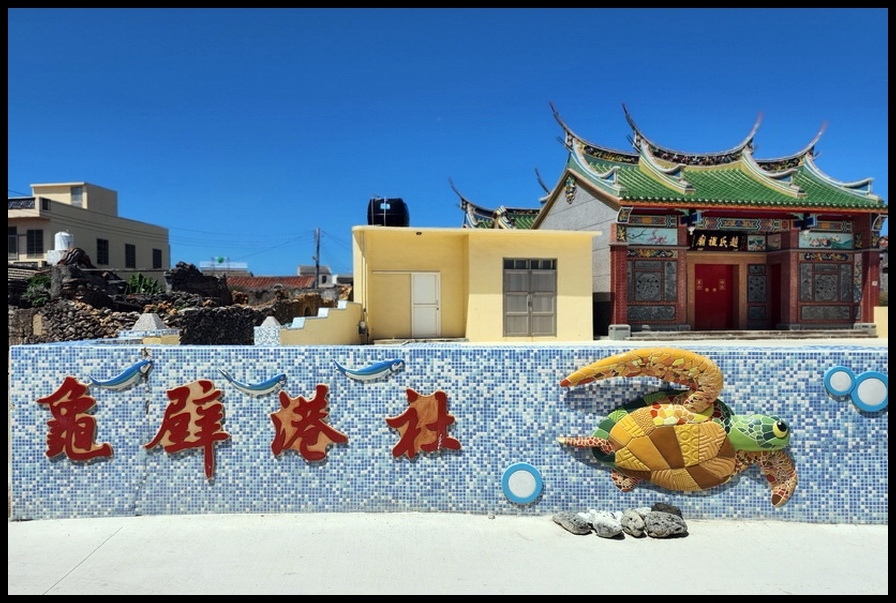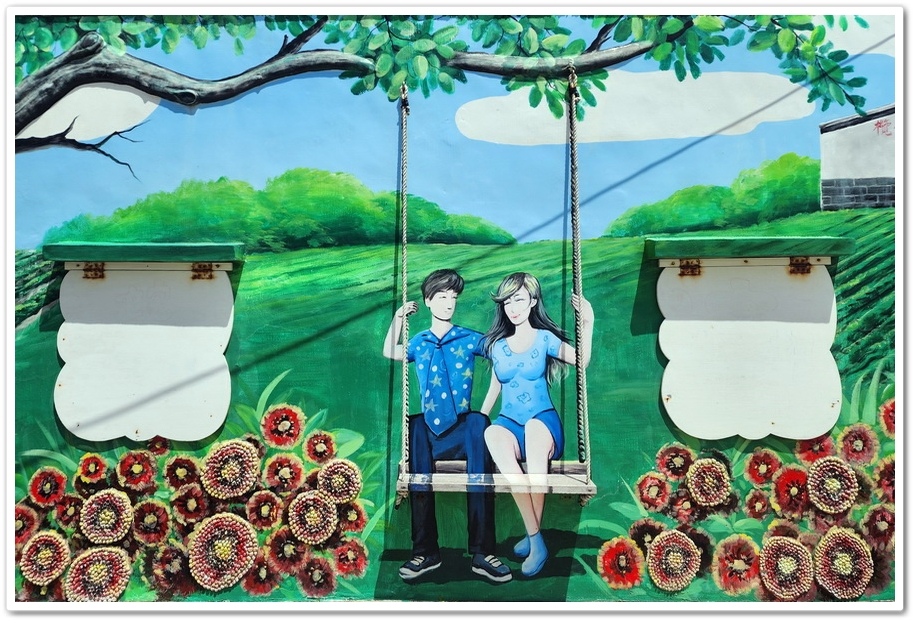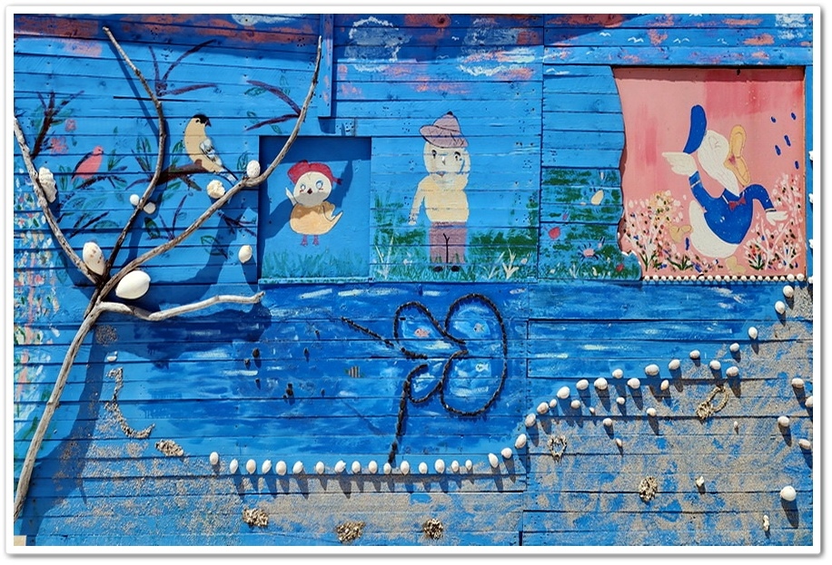 原來是『南寮社區』於2016年獲得行政院『第16屆公共工程金質獎』。然後2017年更榮登『2017全球百大綠色旅遊地』。走進『南寮社區』一旁的民宅外牆,即可看到用石頭拼貼出的彩繪牆,描繪著『南寮社區』婦女特有的蒙面女郎造型與工作的情形,栩栩如生!