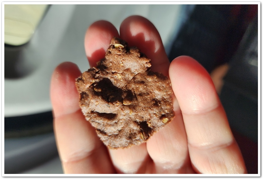 ▲ 這就是澎湖著名的『牛屎餅』。這是可以吃的牛屎餅喔!牛屎餅使用巧克力製作而成的圓片形巧克力餅乾,成分單純,主要有麵粉、巧克力、糖、奶油、雞蛋、鹽、香草莢製成;大小約成人手掌大小,整體吃起來不太甜,口感是偏軟酥餅乾的那種感覺!