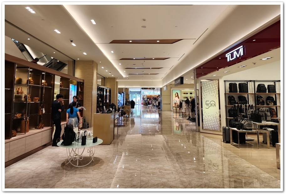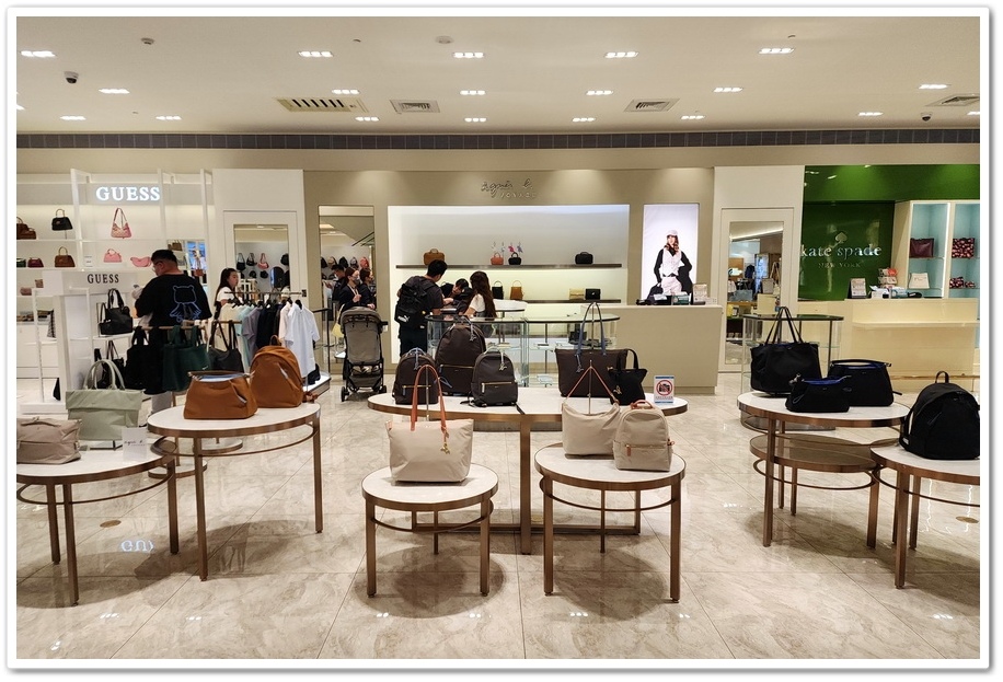 『澎坊Pier3 三號港』地面採大理石磁磚,整個鏡面反光,非常乾淨明亮,一樓大多是世界有名品牌,從國際精品、香水化妝品、藥妝、輕食咖啡、休閒服飾等百貨,有:agnes b、COACH、Furla、GUESS、Kate Spade、Kipling、LeSportsac、Montblonc、TUMI,讓喜歡購買名牌的旅客,可盡情購買!